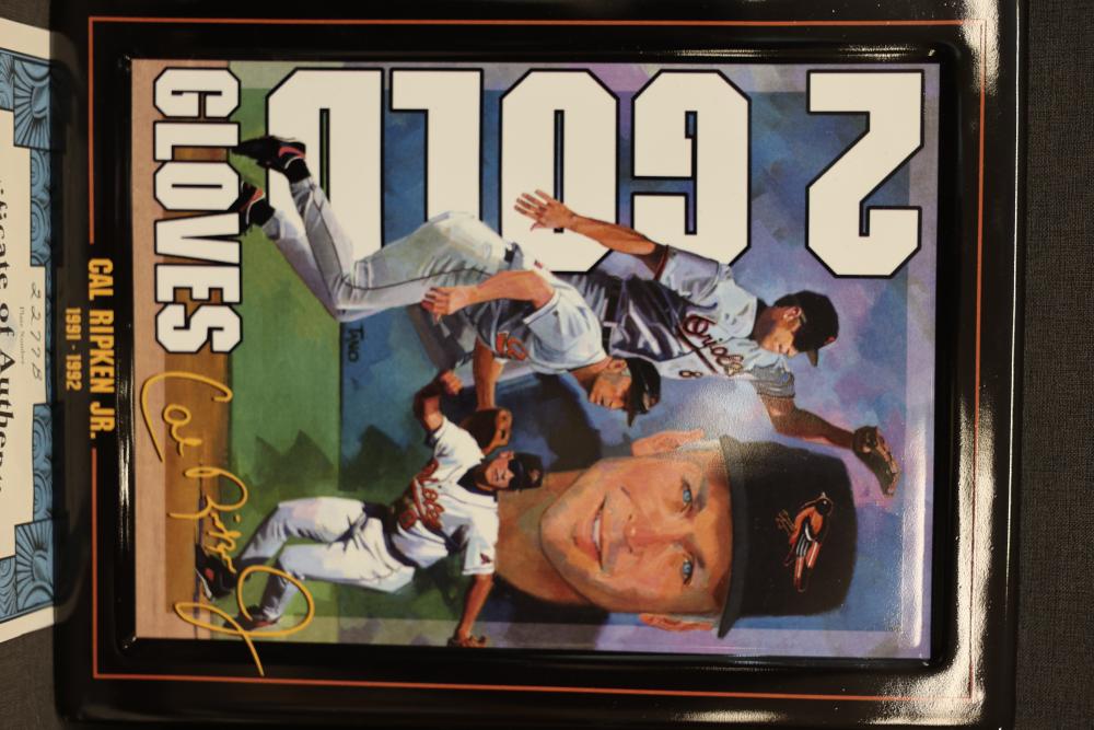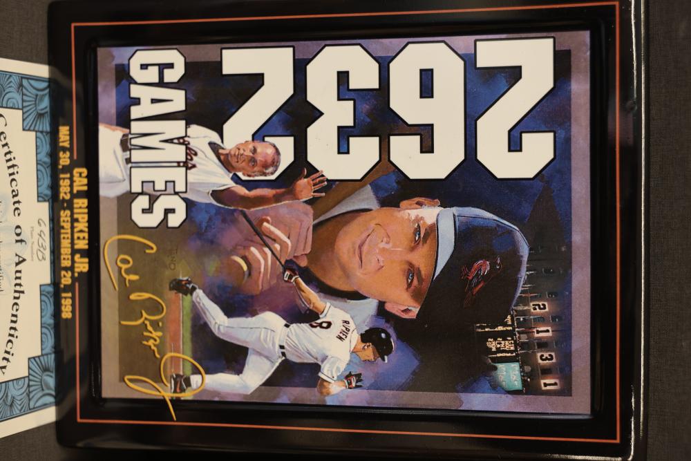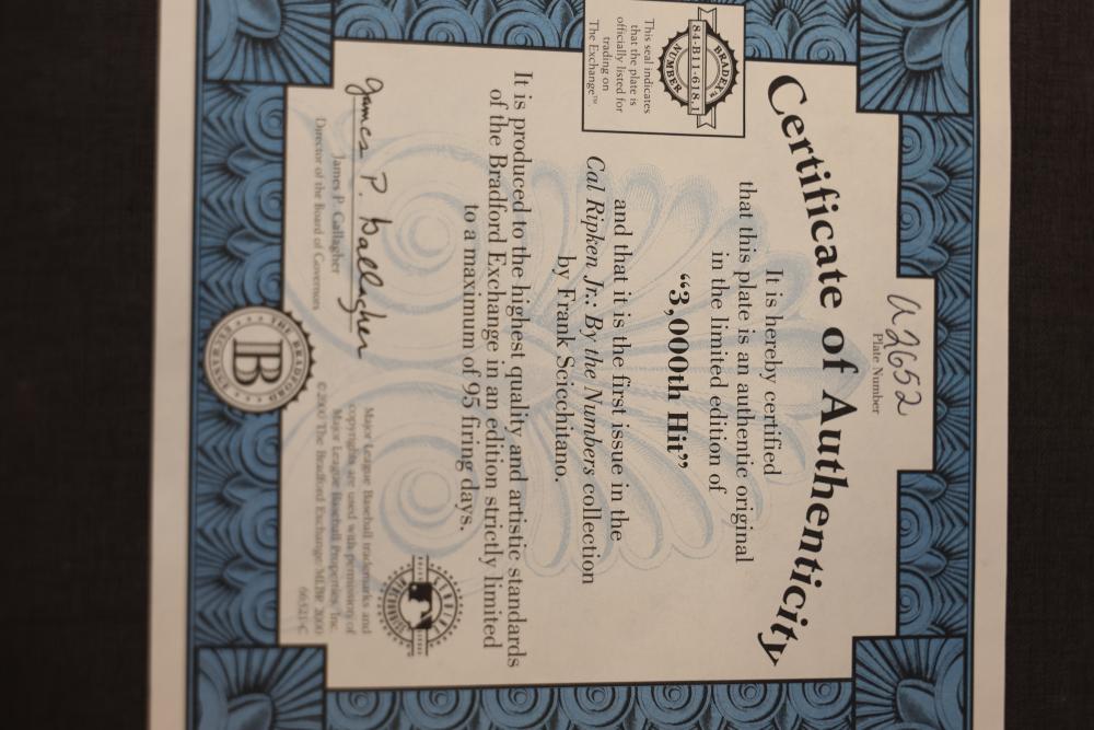Cal Ripken Jr. and John Elway decorative plates and plaques with certificates of authenticity. Includes six framed plaques featuring milestones of Cal Ripken Jr.: '2 Time MVP,' '2632 Games,' '2 Gold Gloves,' '400 Home Runs,' '3000 Hits,' and corresponding certificates. Also includes two Cal Ripken Jr. collectible plates depicting '2131 Consecutive Games' achievements and one John Elway collectible plate highlighting his football career. Pickup only.