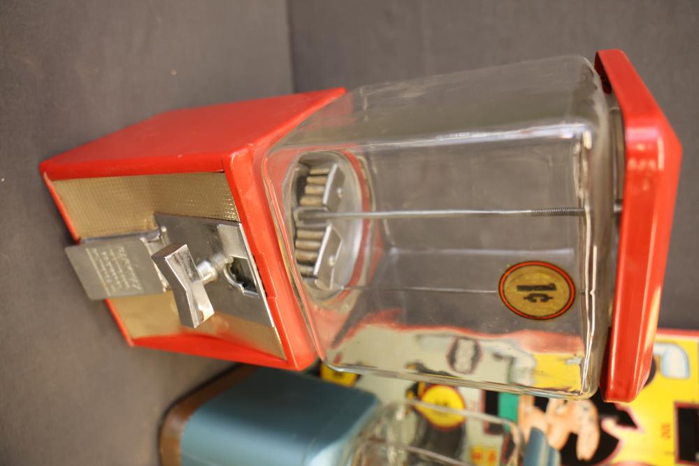 Vintage Arcade Machines and Coin-Operated Vending Machines. Includes a wooden 'What Is My Weakness?' game machine with internal wiring visible in the back panel, along with Parkway and Universal Venders coin-operated machines in red and blue finishes and a small peanut dispenser. Includes a colorful 'Shooting Gallery' arcade target board by MAR Toys. Condition shows wear consistent with age. Pickup only.