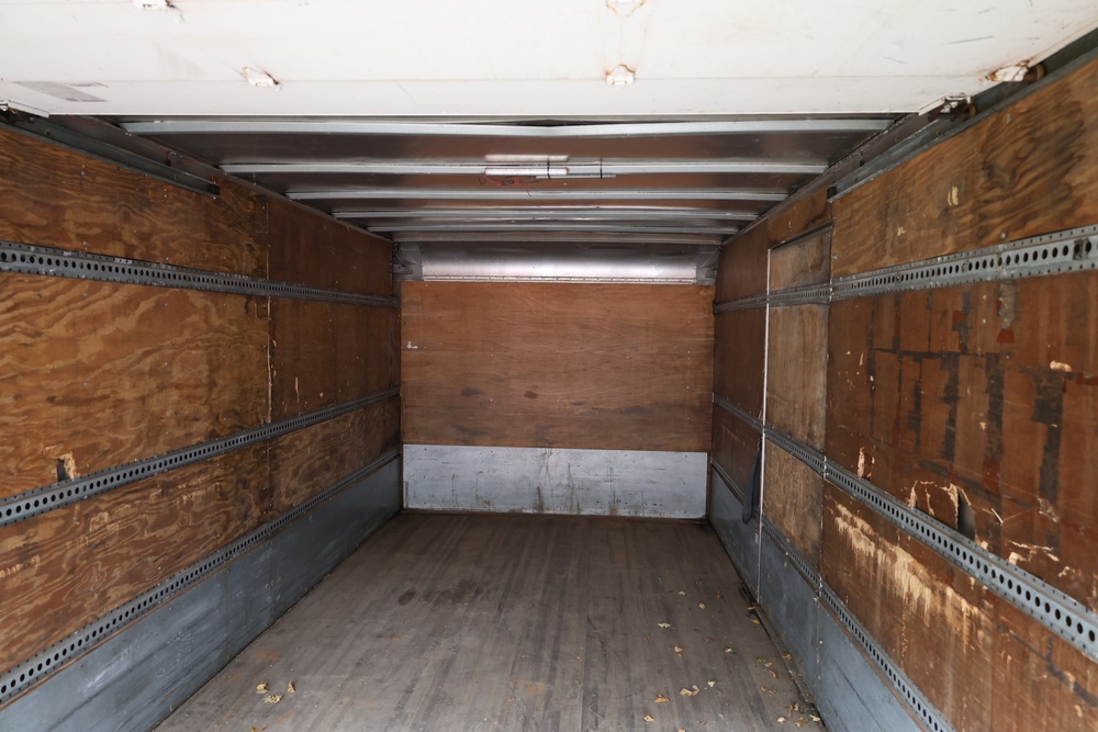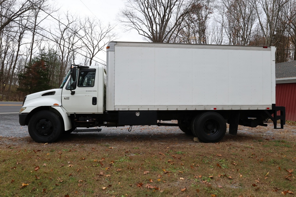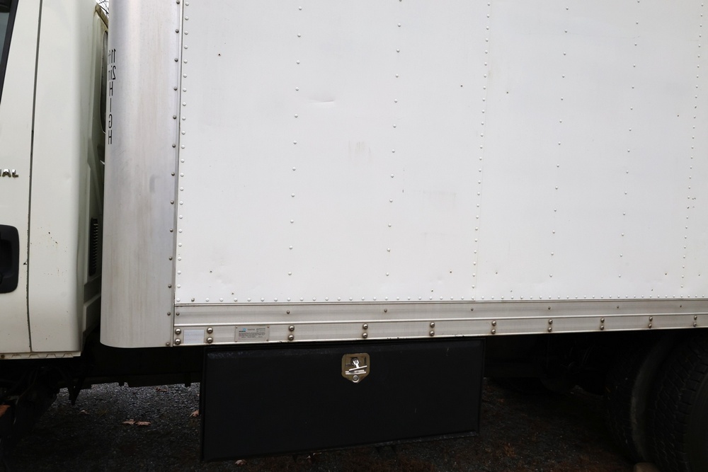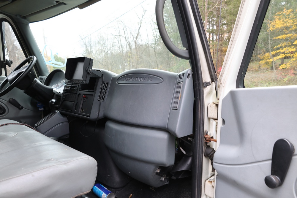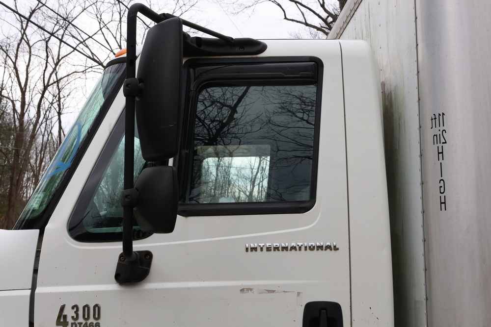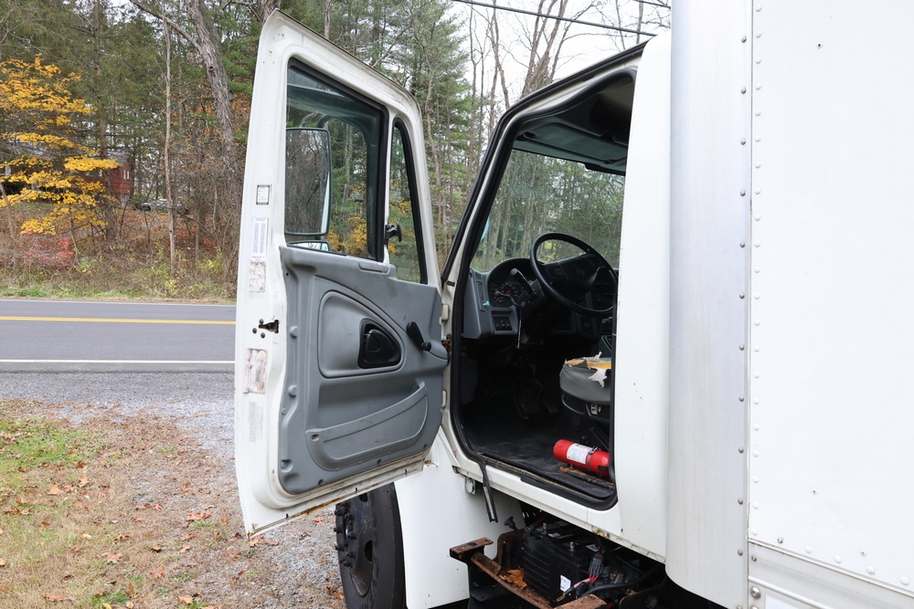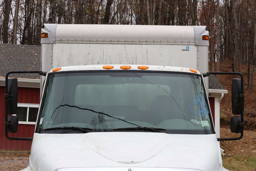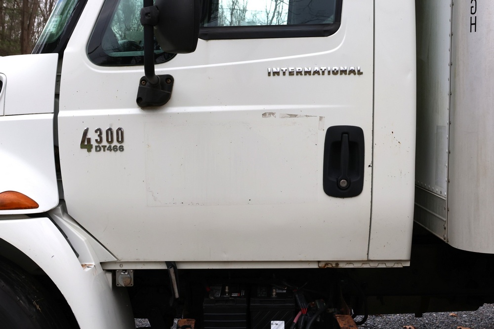 2005 International 4300 box truck. VIN: 1HTMMAAM05H118283. Odometer reading: 216510. Manufactured by International Truck and Engine Corporation, Chicago, Illinois. Equipped with a DT466 7.6L inline 6-cylinder diesel engine rated at 220 HP @ 2300 RPM and 540 lb-ft torque @ 1400 RPM, paired with an automatic transmission. Configuration: 4x2 with a 690-inch wheelbase. Features include a Morgan 25,500 lb GVWR box body, dual rear wheels, hydraulic liftgate, side access door, and roll-up rear door. The cab is a standard day cab layout with grey vinyl seating, air conditioning controls, and an installed fire extinguisher. Interior cargo area has wood paneling with E-track tie-down rails. Seller reports: Runs and drives however brakes are soft and need attention. May need a jumpstart at pickup. Title and key available.