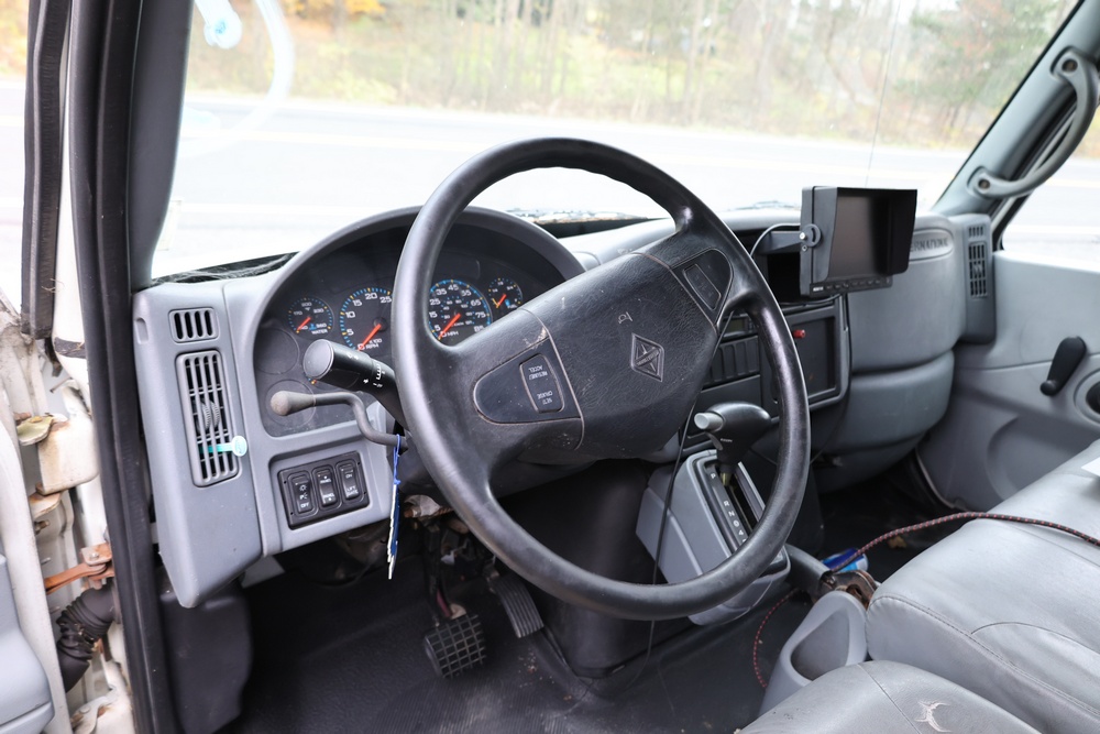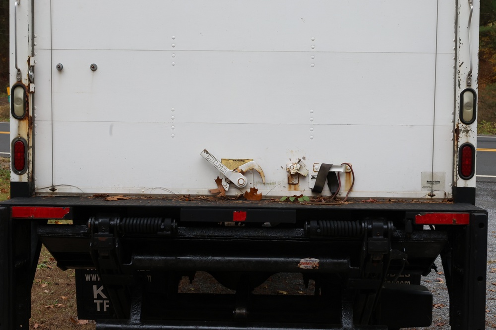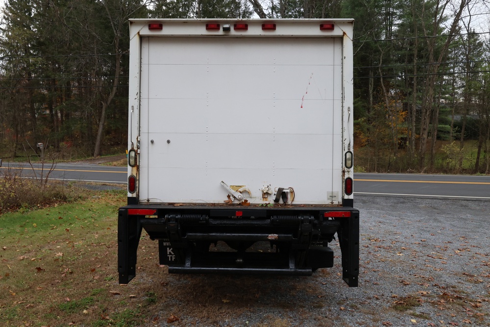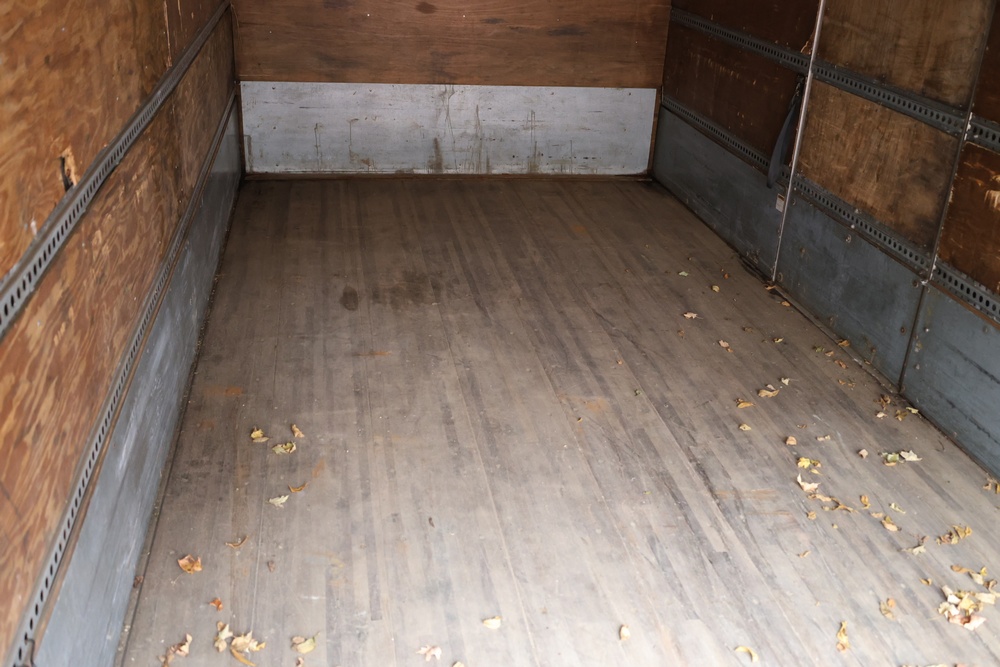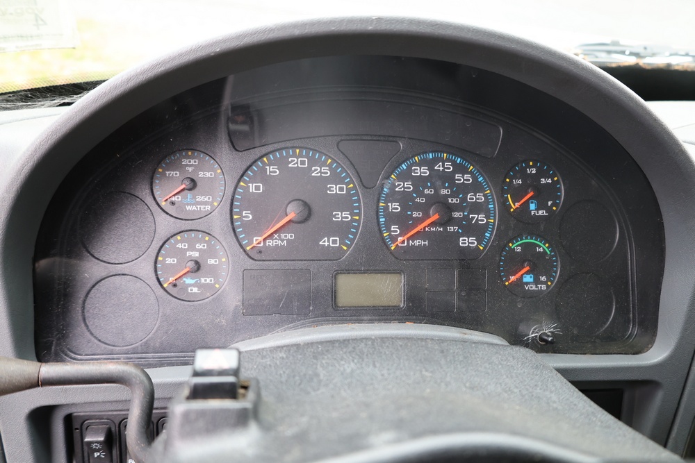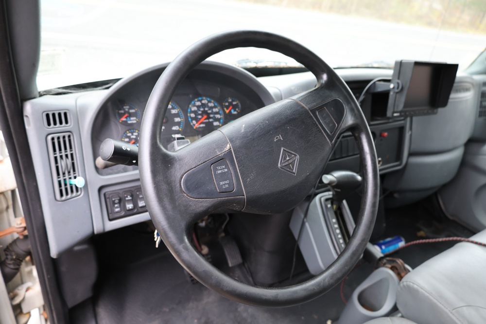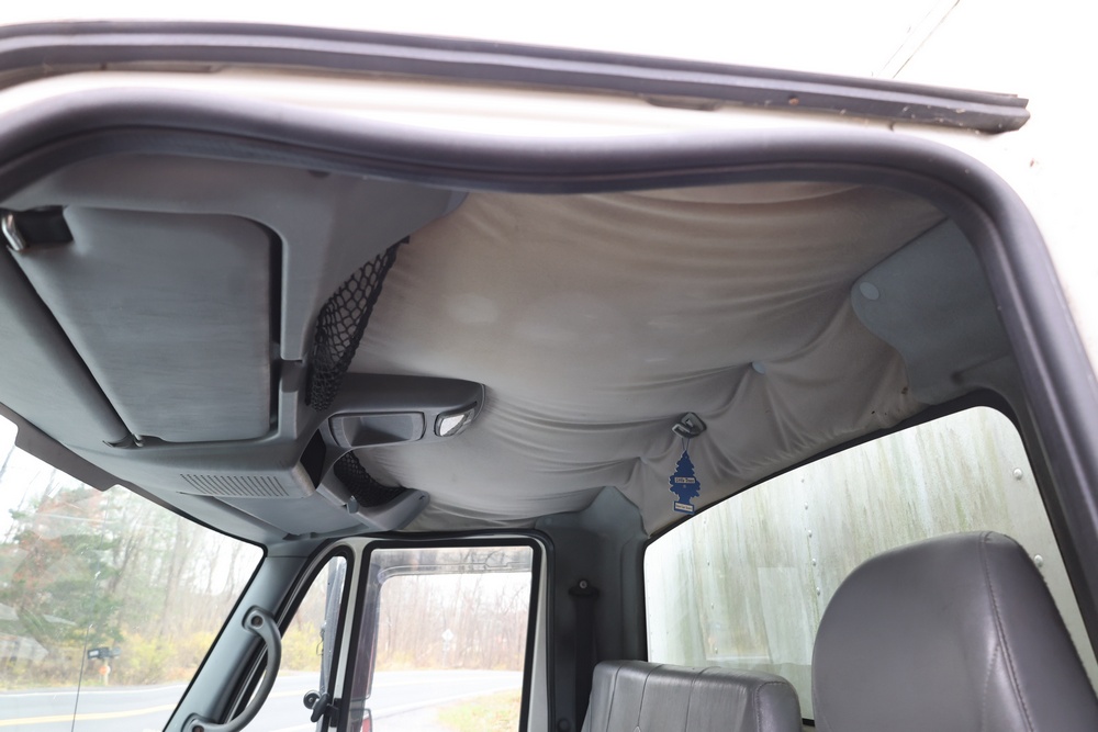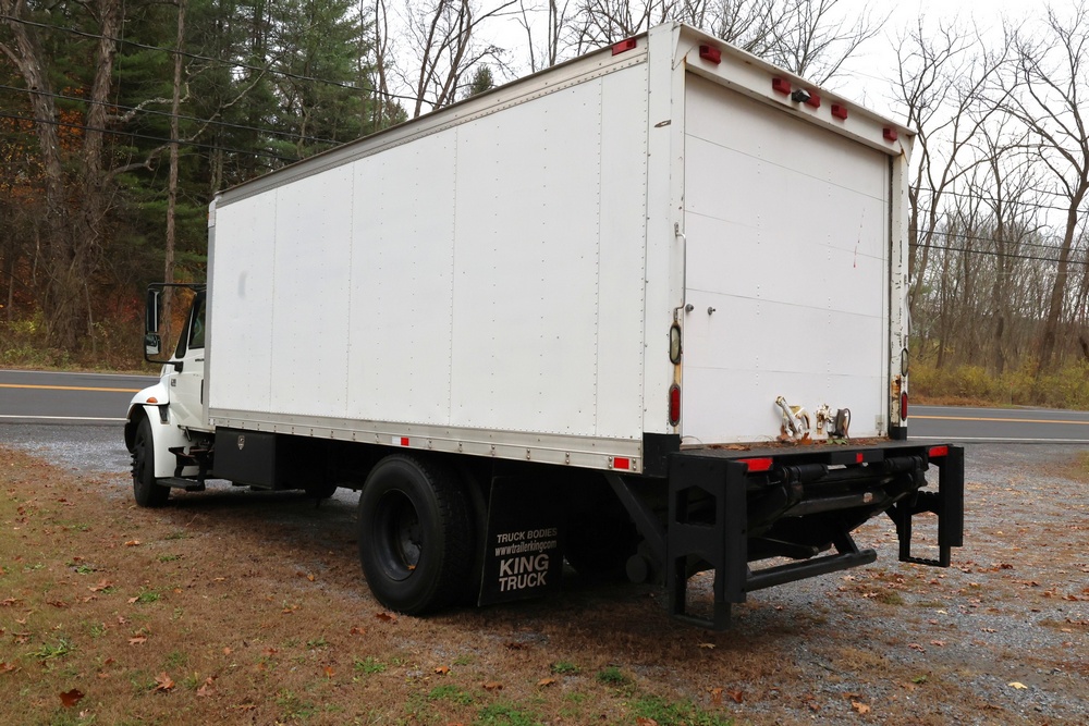 2005 International 4300 box truck. VIN: 1HTMMAAM05H118283. Odometer reading: 216510. Manufactured by International Truck and Engine Corporation, Chicago, Illinois. Equipped with a DT466 7.6L inline 6-cylinder diesel engine rated at 220 HP @ 2300 RPM and 540 lb-ft torque @ 1400 RPM, paired with an automatic transmission. Configuration: 4x2 with a 690-inch wheelbase. Features include a Morgan 25,500 lb GVWR box body, dual rear wheels, hydraulic liftgate, side access door, and roll-up rear door. The cab is a standard day cab layout with grey vinyl seating, air conditioning controls, and an installed fire extinguisher. Interior cargo area has wood paneling with E-track tie-down rails. Seller reports: Runs and drives however brakes are soft and need attention. May need a jumpstart at pickup. Title and key available.
