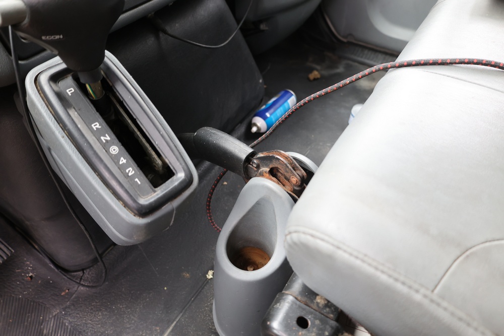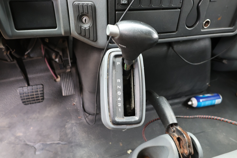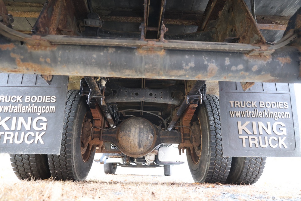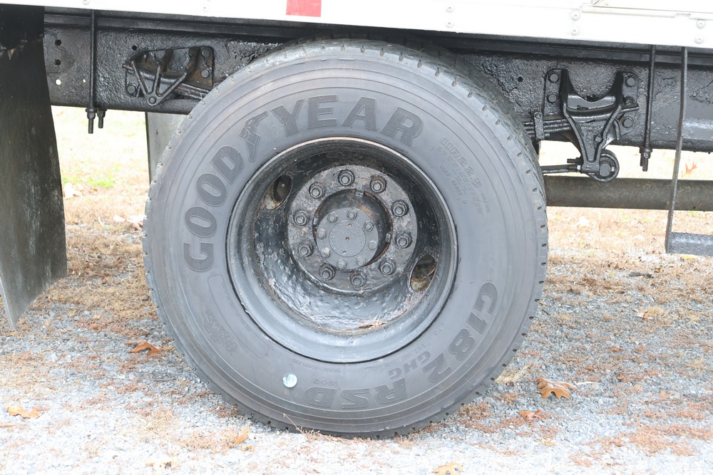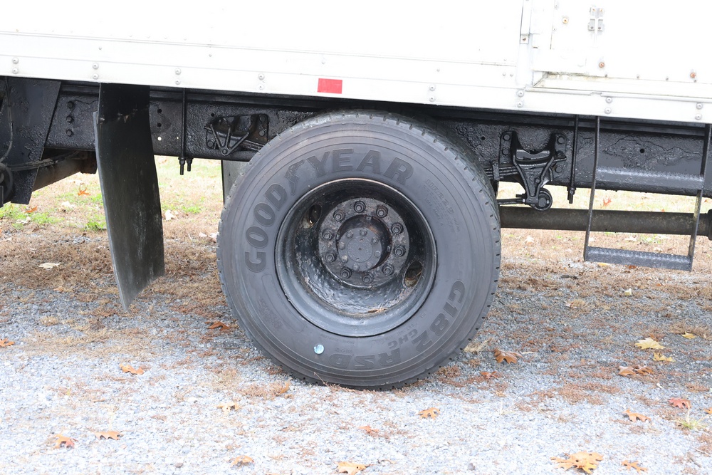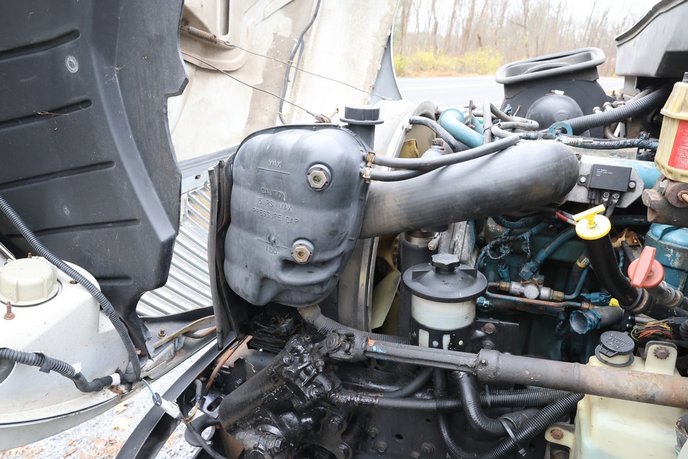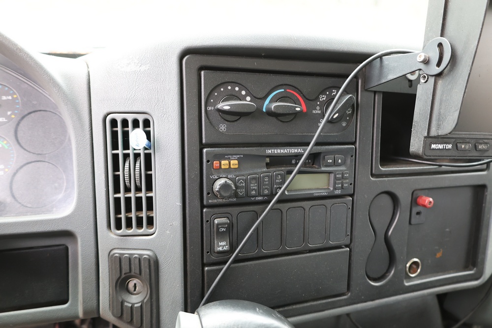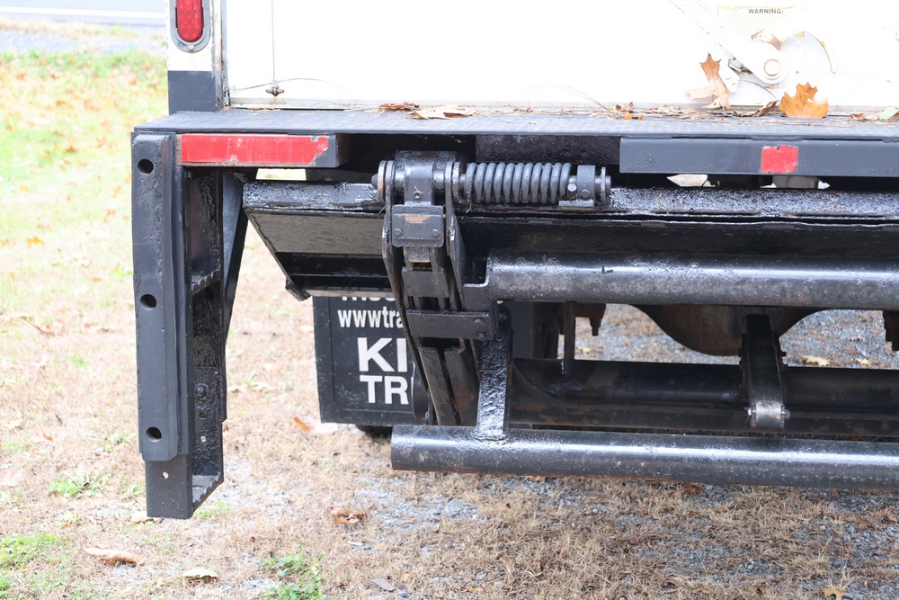 2005 International 4300 box truck. VIN: 1HTMMAAM05H118283. Odometer reading: 216510. Manufactured by International Truck and Engine Corporation, Chicago, Illinois. Equipped with a DT466 7.6L inline 6-cylinder diesel engine rated at 220 HP @ 2300 RPM and 540 lb-ft torque @ 1400 RPM, paired with an automatic transmission. Configuration: 4x2 with a 690-inch wheelbase. Features include a Morgan 25,500 lb GVWR box body, dual rear wheels, hydraulic liftgate, side access door, and roll-up rear door. The cab is a standard day cab layout with grey vinyl seating, air conditioning controls, and an installed fire extinguisher. Interior cargo area has wood paneling with E-track tie-down rails. Seller reports: Runs and drives however brakes are soft and need attention. May need a jumpstart at pickup. Title and key available.