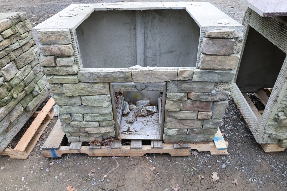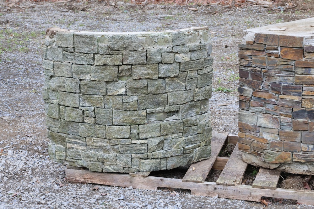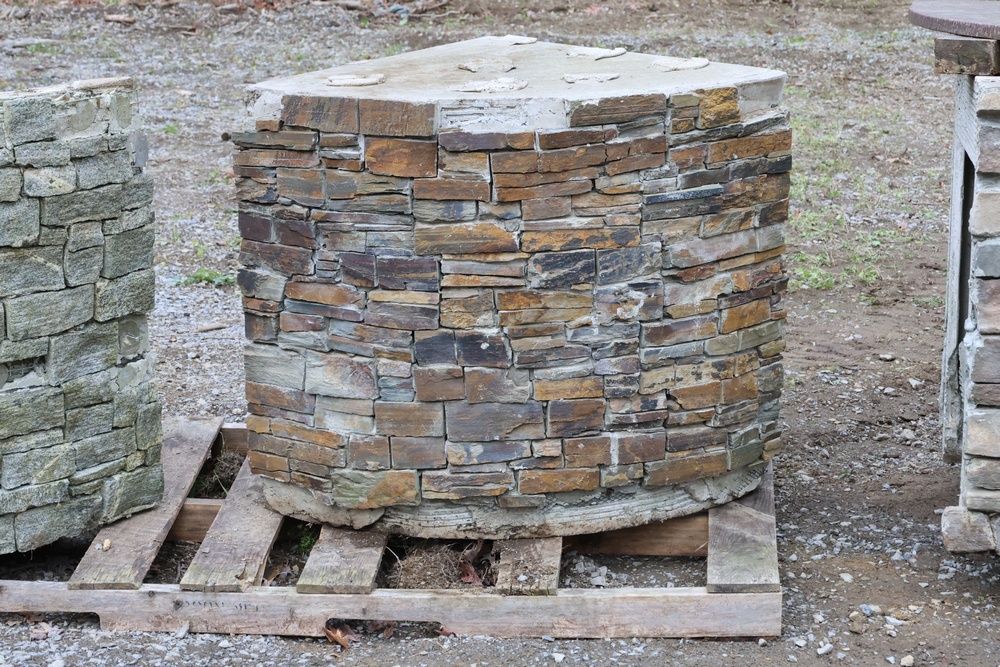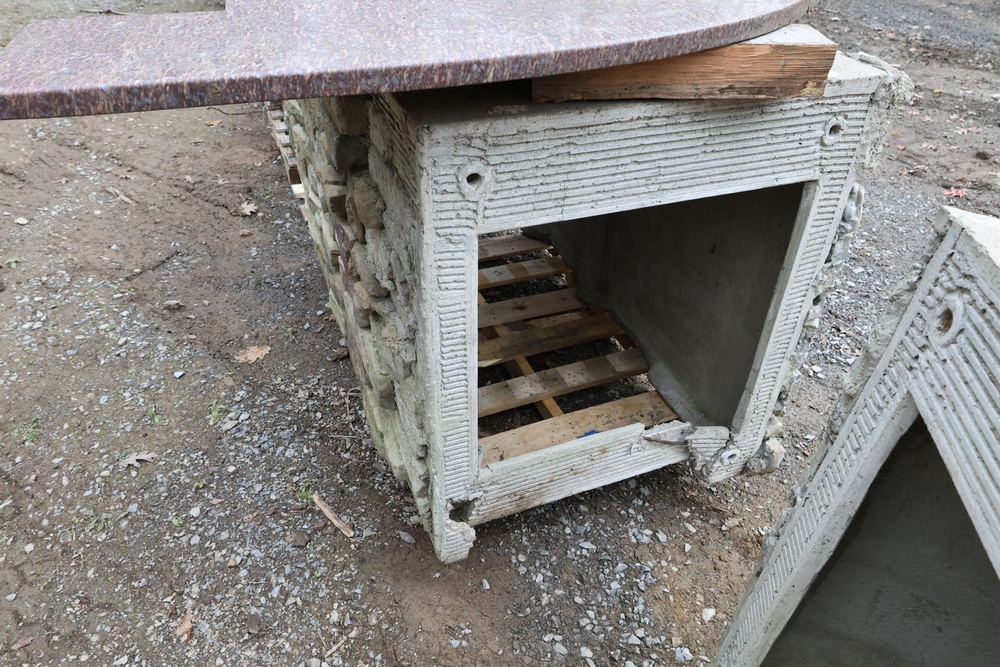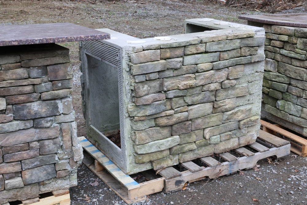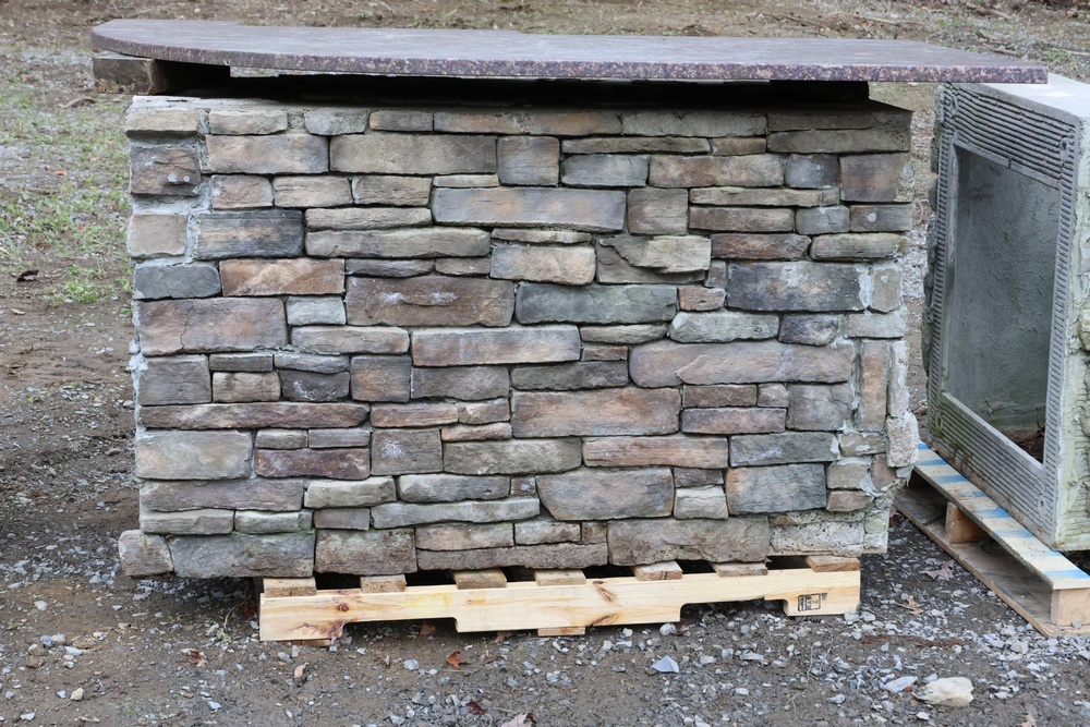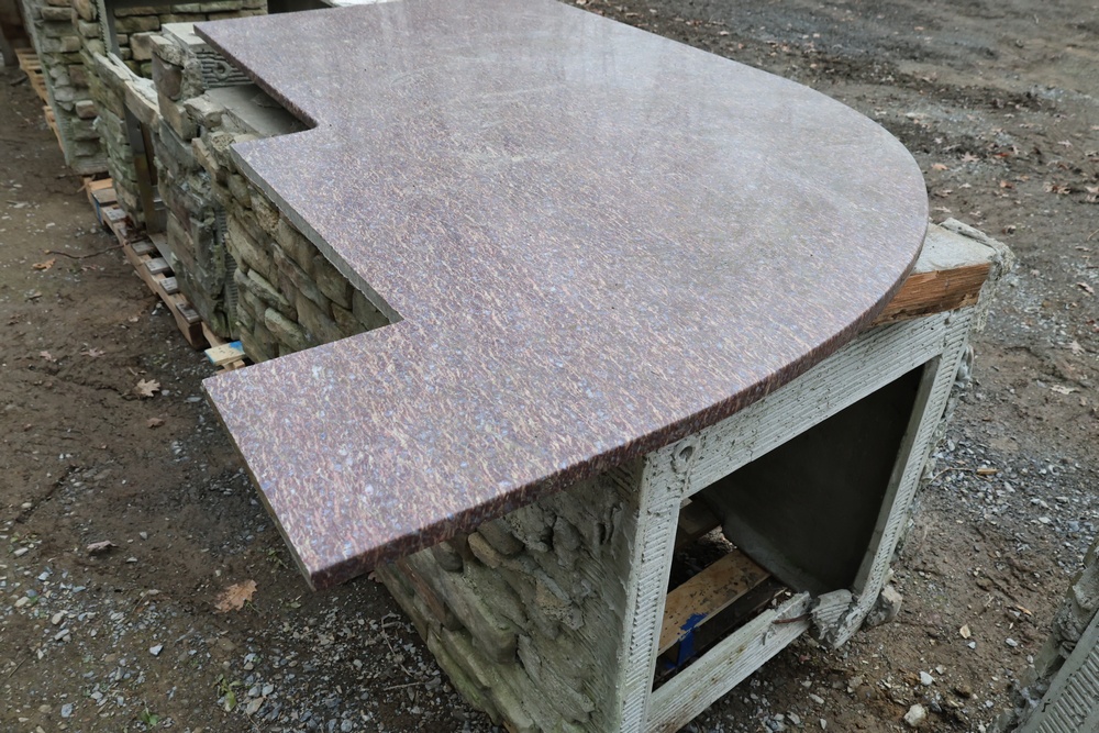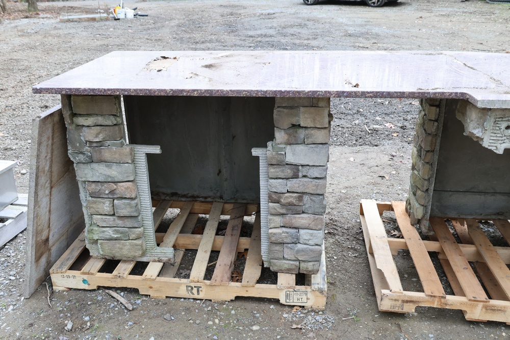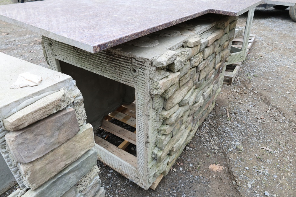 Outdoor kitchen consisting of multiple island bases with stone-veneer exteriors, matching stone countertop sections, and a stainless-steel U-Line freezer (model U-BI1215SOD-00A). The bases are designed to accommodate built-in components such as grills, refrigerators, or sink modules. Also included are stainless-steel food-prep and service units with integrated compartments and a faucet assembly. The first photo is provided for reference only; all other photos show the items included in the lot. Assistance will be available to load onto an appropriate vehicle/trailer. Freezer in unknown condition.