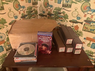 Vintage and Modern Electronics, Cabinets. vintage TV in wood cab, 25"Wx21"Dx37"H; flat screen TV's; Bushnell telescope in box; Onkyo compac disc player; media; other related items as seen in photos, incl wood record cab, 27"X17"Sx30"H. Carpet not incl.
