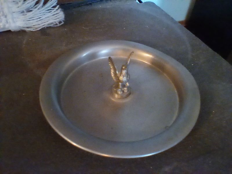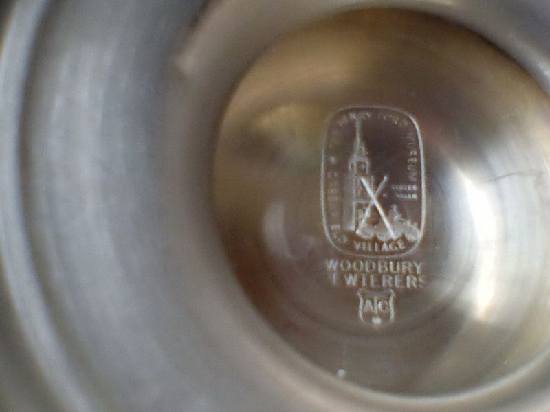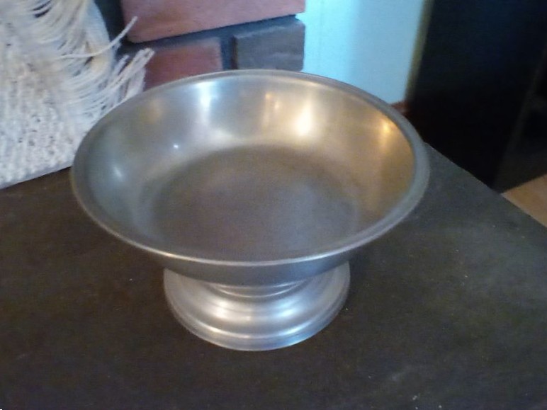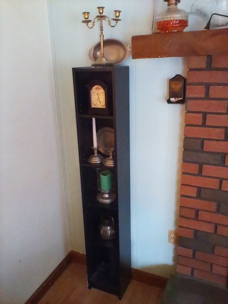 Vintage Décor, featuring Woodbury Pewter, Book Shelves. Several pieces Vintage décor and ent, incl at least two Woodbury pewter bowls (two sizes, one not photographed); oil lamp with glass shade; antique wall mirror; brass pieces; fireplace bellows; vases; dishes; small mantle clock; pr black modern narrow book shelves. See photos for more details.