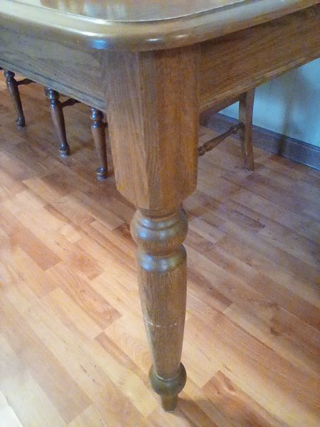 Maple Farm Table and Country Hutch. Maple oblong table (seats eight); coordinating open-style hutch with plate grooves; large dovetailed linen drawer & storage below; pair of stenciled Hitchcock chairs. See photos for condition of chairs and clean break in hutch (does not effect functionality).