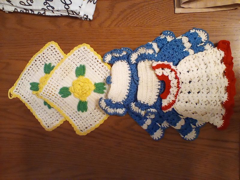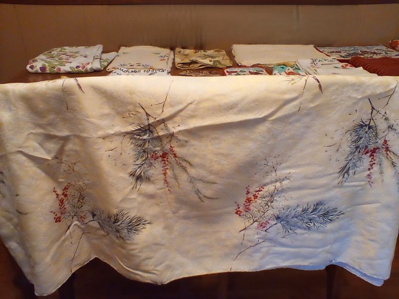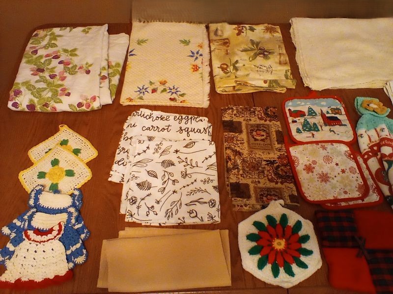 Table Linens, Towels, Pot Holders. Mostly Vintage table cloths (some seasonal) with plastic storage bag; assort hand towels; hand-crocheted pot holders. See photos for quantity and patterns. Furniture seen in photos not incl.