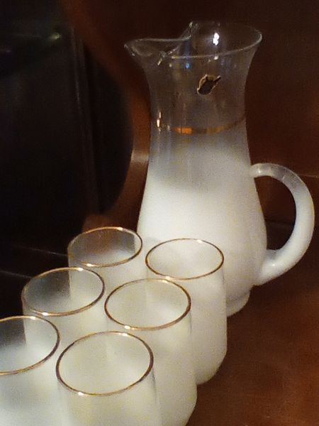 Vintage Décor, featuring Milk Glass. Approx 3-doz items, incl: pedestal cake dish; seven-piece West Virginian beverage set (pitcher & 6 glasses); hobnail double-handle dish; McCoy vessel; creamer & sugar sets; S&P; egg dash; white hobnail covered canister; two-piece ceramic egg dish; much more as seen in photos. Furniture incl in lot #6.
