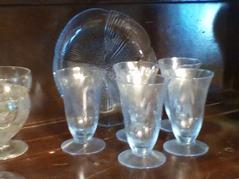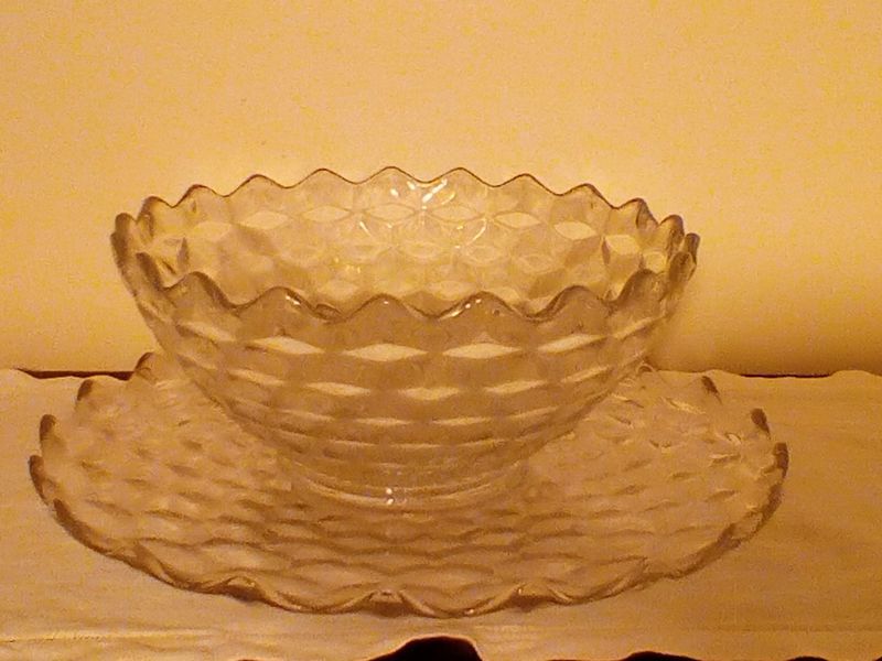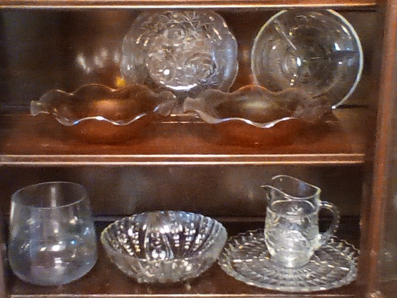 Vintage Colored and Clear Glass Entertaining. Over 30 pieces, incl carnival glass and lg punch bowl with platter; blue depression glasses, creamer; plate; pr scalloped bowls; lg clear glass container; platters; dishes; bowls and more! See photos for details. Furniture incl in lot #10.