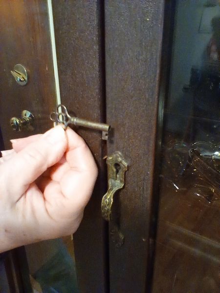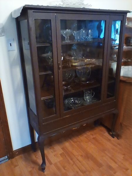 Antique Hutch with Key. Dark stained, double plate grooved glass front & side antique hutch with key to lock. See photos for cond. Contents incl in lot #9.