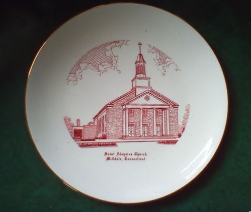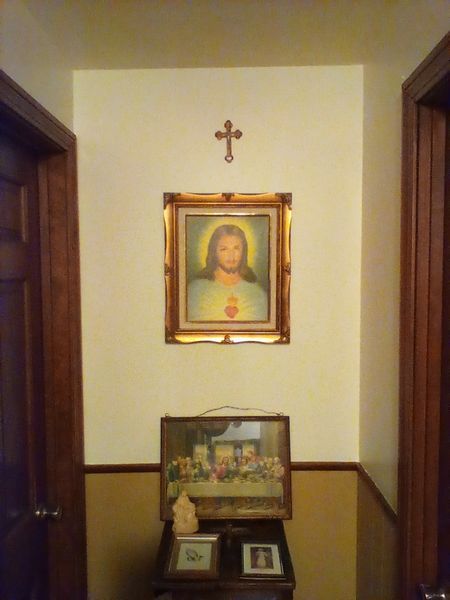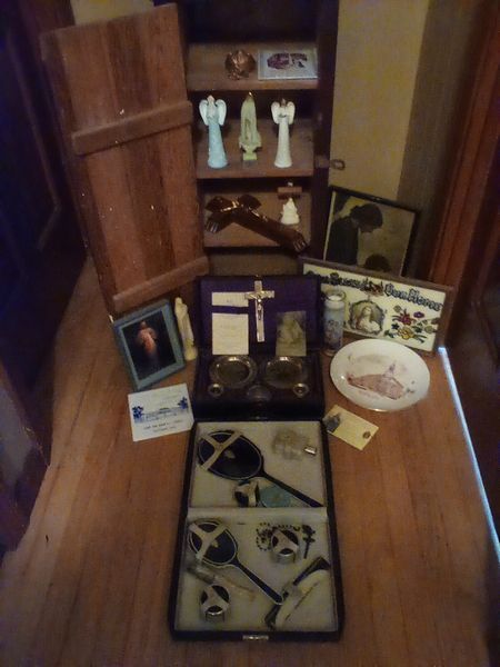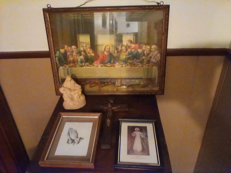Religious Items, Wood Cabinet. Catholic religion items incl statues, incl Pieta; wall art, incl gilt-framed Jesus Christ; two boxed communion sets; crucifix; porcelain collector's plate; wood storage. See photos for more details.