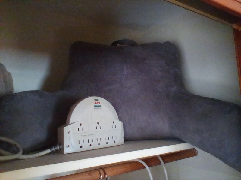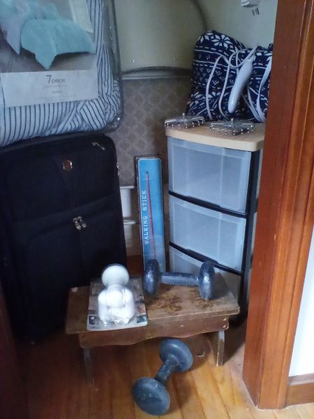 Household Functional. Incl: Am Tourister travel garment bag; suitcase; folding chair; bed rest; wood hangers; two blankets; bed set; three-drawer plastic storage; wood foot rest; multi outlet device; pr 10lb weights; extension cords.