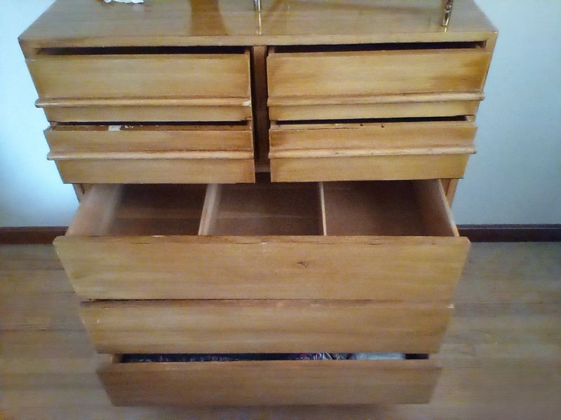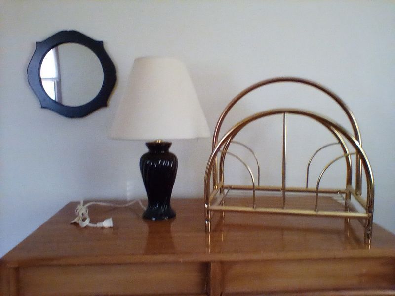 Mid-Century Modern Dresser, Lamp, Mirror, Magazine Rack. Seven dovetailed drawer MCM light wood dresser by American Furniture; blk wall mirror, table lamp & shade; brass mag rack.