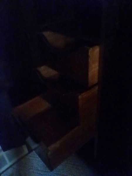 antique Wardrobe Cabinet, Lamp, Dark stained antique wardrobe cab with drawer storage & clothing bar, white porcelain knobs; country-style tannle lamp; extra pleated shade.