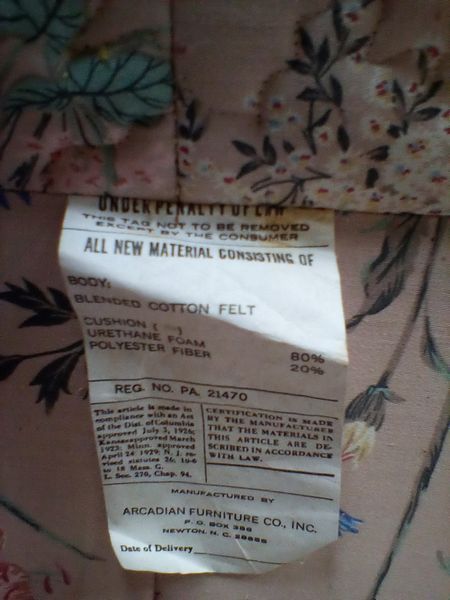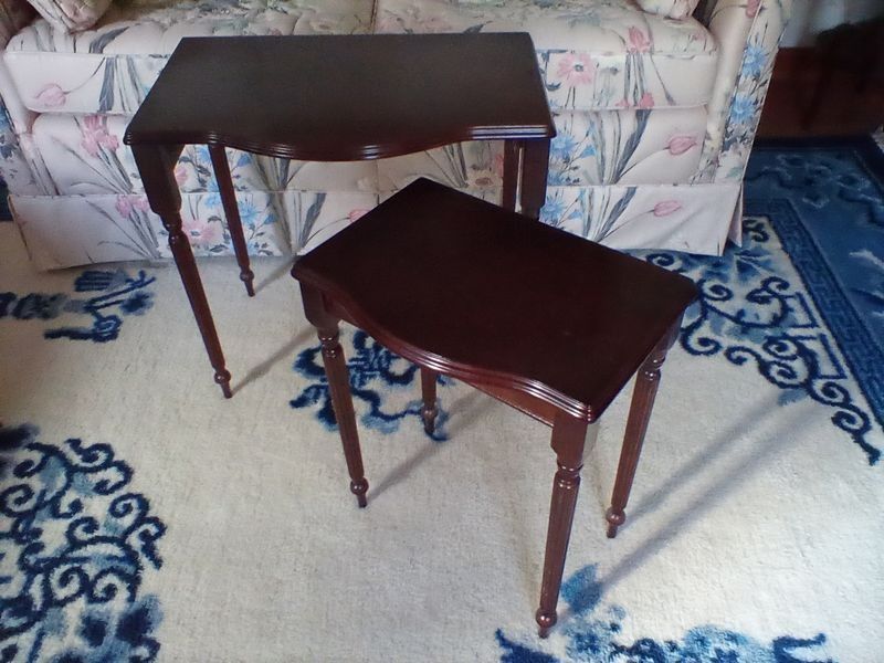Loveseat Sofa, Nesting Tables. Arcadian Furniture Co. 5' loveseat sofa x26"Dx27"H; set of 2 wood nesting tables, larger 22"Wx13'Dx20"H. Rug seen in photos not included