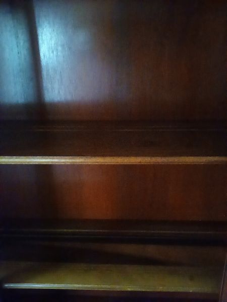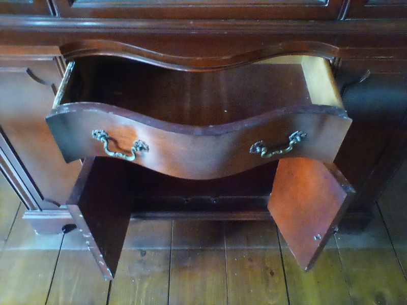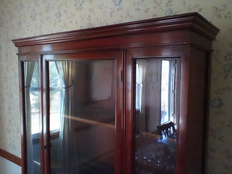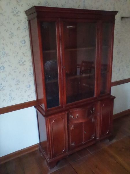 Formal Cherry China Hutch. Glass front China cab with crown molding & double plate grooved wood shelves over single dovetailed drawer & cab storage, 42"Wx14"Dx70"H.