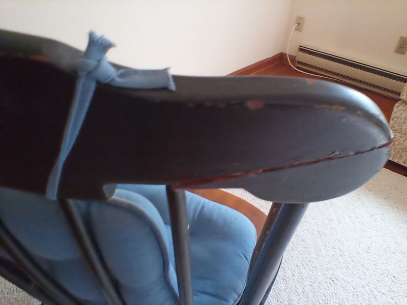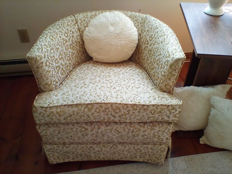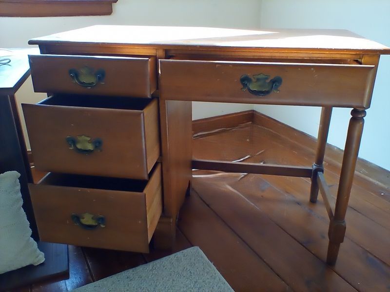 Furniture, Area Rug. Buyer's Choice: rocking chair; barrel chair (matches lot #1); student desk with four dovetailed-drawers, 39"Wx19"Dx29"H; side chair; lamp table; large nylon area rug; throw pillow; small table lamp. See photos for conditon. Located on the second floor & in basement.