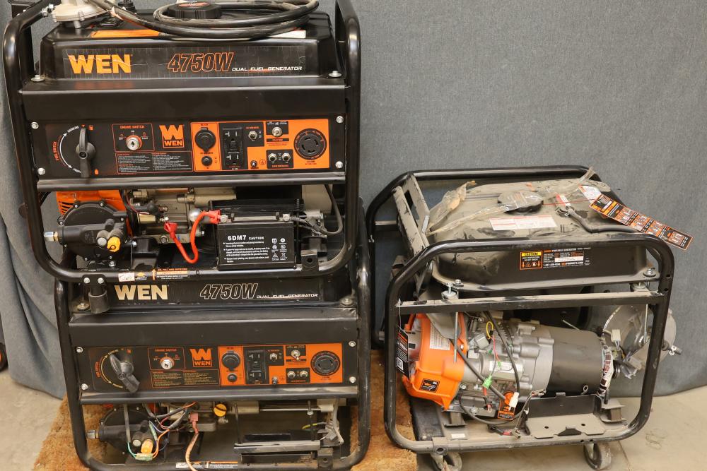 N/O WEN 4750W Dual-Fuel Portable Generators and GN5602X Portable Generator units, nonoperational and suitable for parts use only. Rated wattage specifications: 3800W (gas), 3500W (LPG) for DF475T and 4500W for GN5602X. Surge wattage specifications: 4750W (gas), 4350W (LPG) for DF475T and 5600W for GN5602X. Fuel capacity includes 4 gallons and 4.36 gallons for gas, respectively. Does not include dollies. Pickup only.
