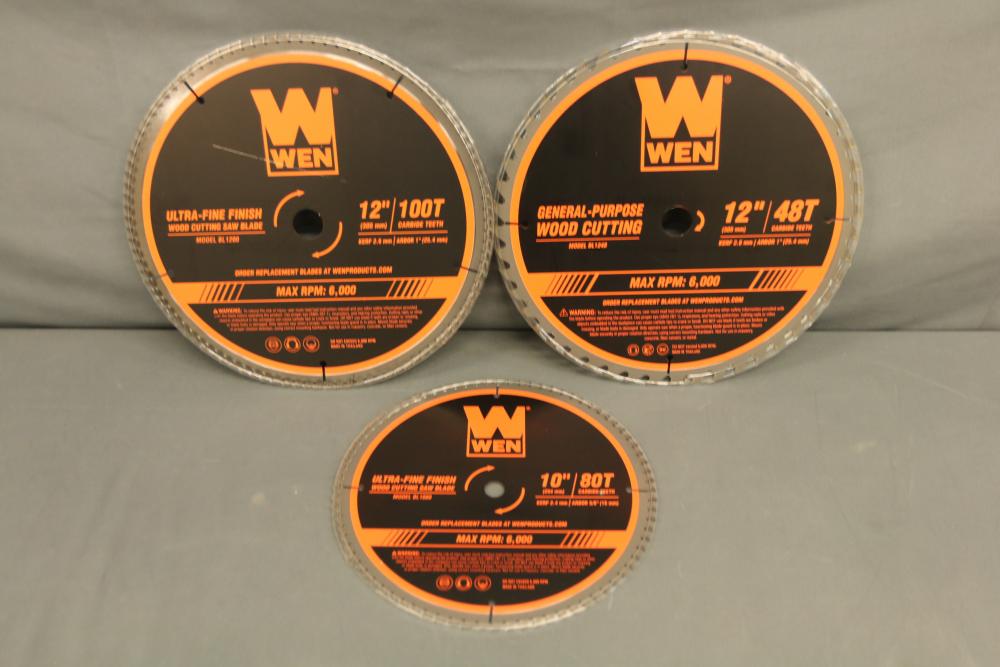WEN Wood Cutting Saw Blades, Including 10-Inch 80T, 12-Inch 100T, and 12-Inch 48T. Includes models BL1080, BL1200, and BL1248 with a maximum RPM of 6,000. Pickup only.