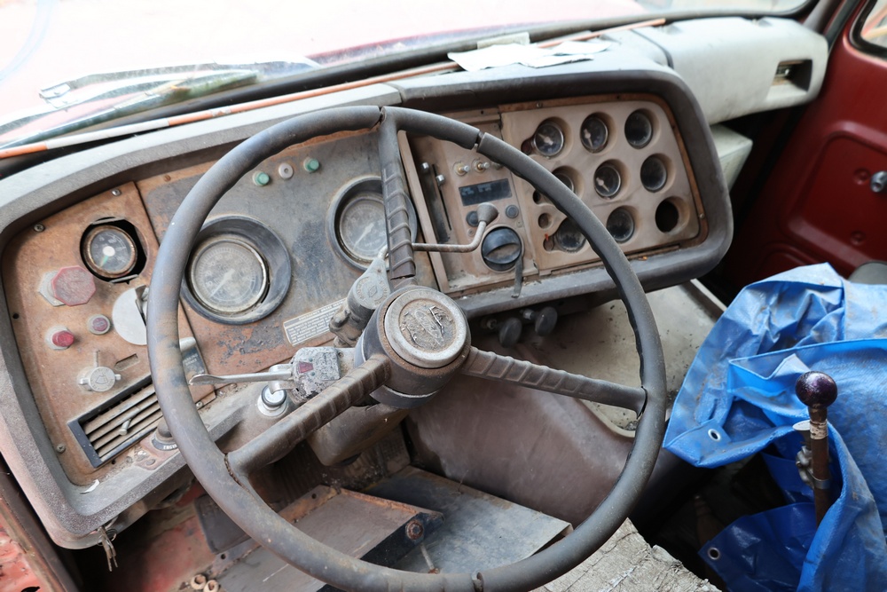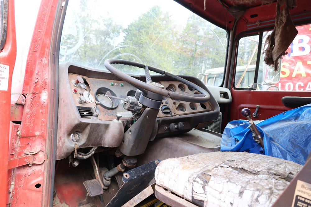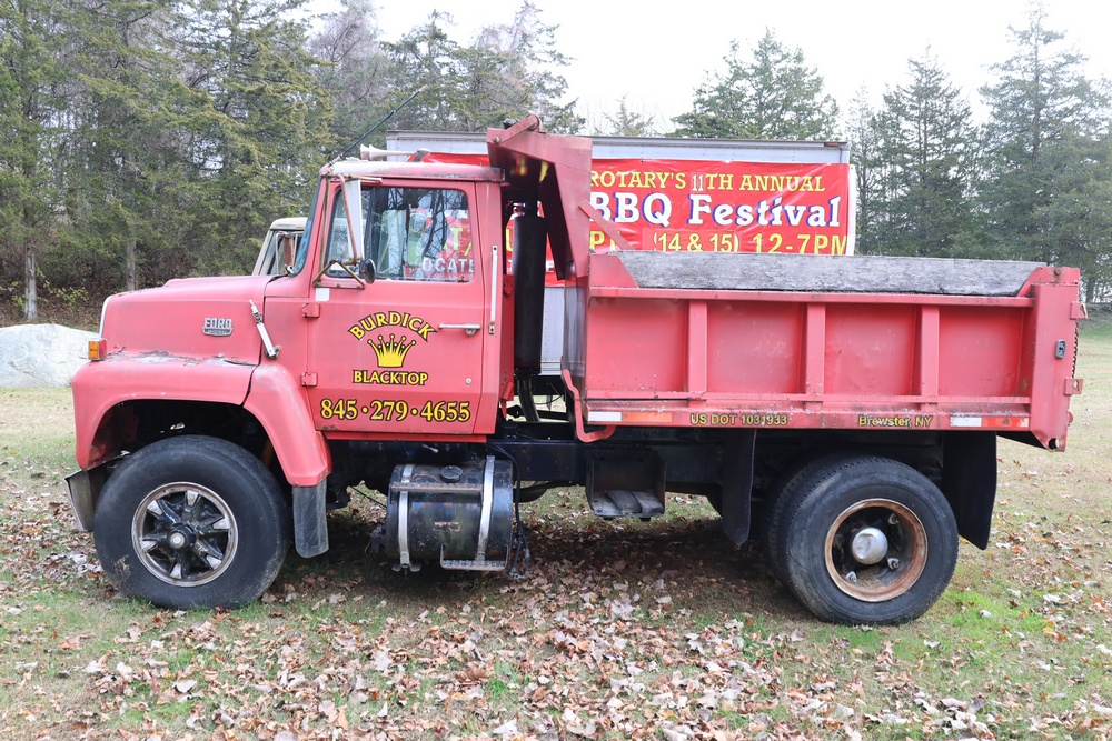 1978 Ford dump truck. VIN: R902VDE6672. Body: two-door dump truck with steel dump bed and dual rear wheels. Engine: 671 Detroit Diesel. Transmission: 10 speed road ranger manual with floor-mounted shifter. Odometer reading: 214821. Features include a front chrome grille, dual fuel tanks, left-hand mirror, multi-gauge instrument cluster, and hydraulic dump assembly. Seller reports: hasn't been used, ran when parked, motor will turn over. Bill of sale only. Battery may need to be replaced.