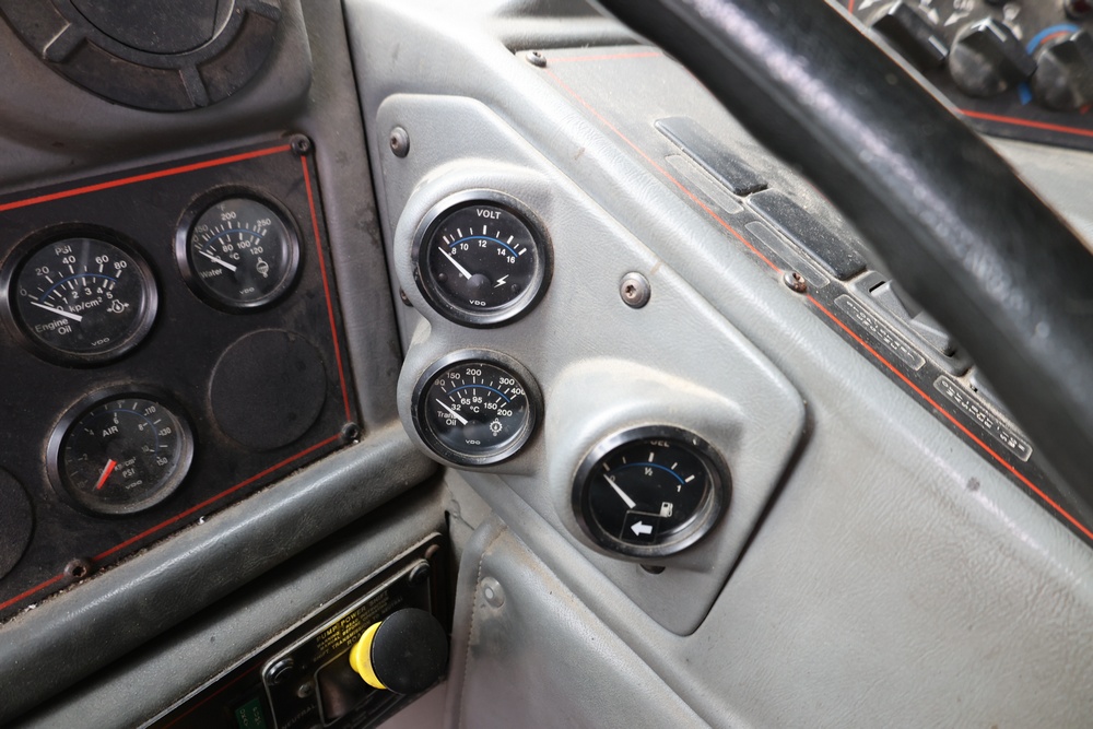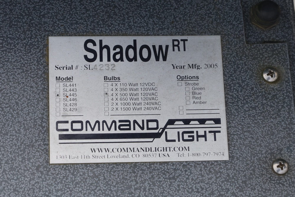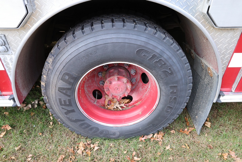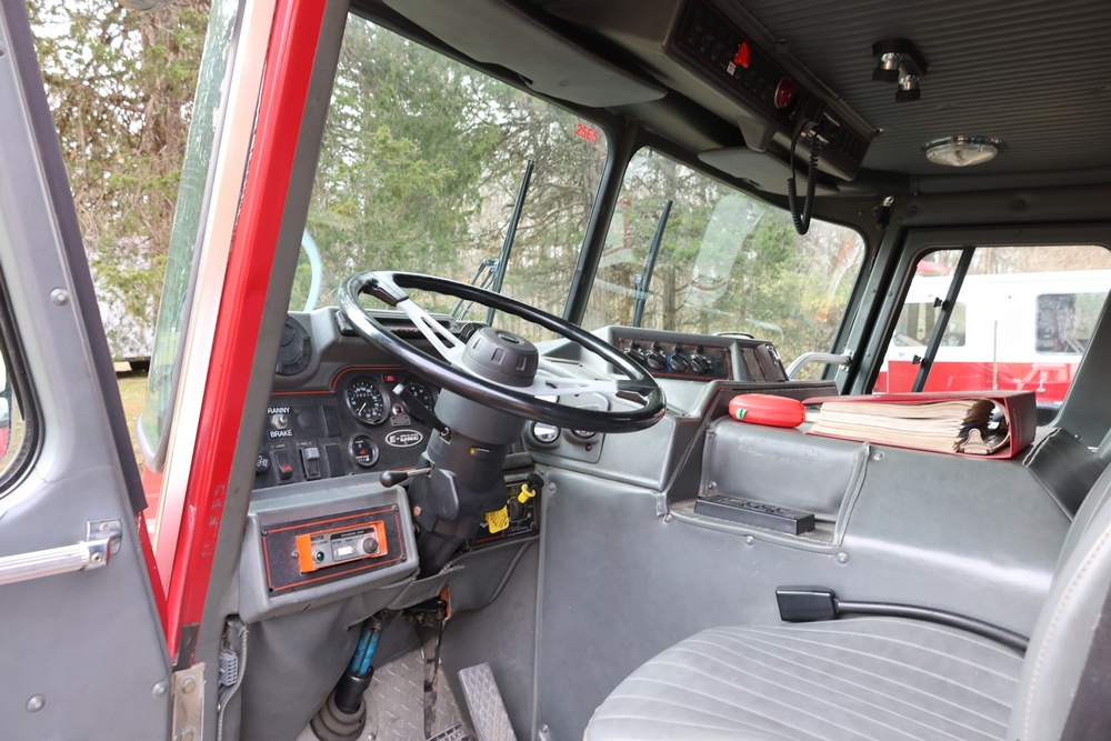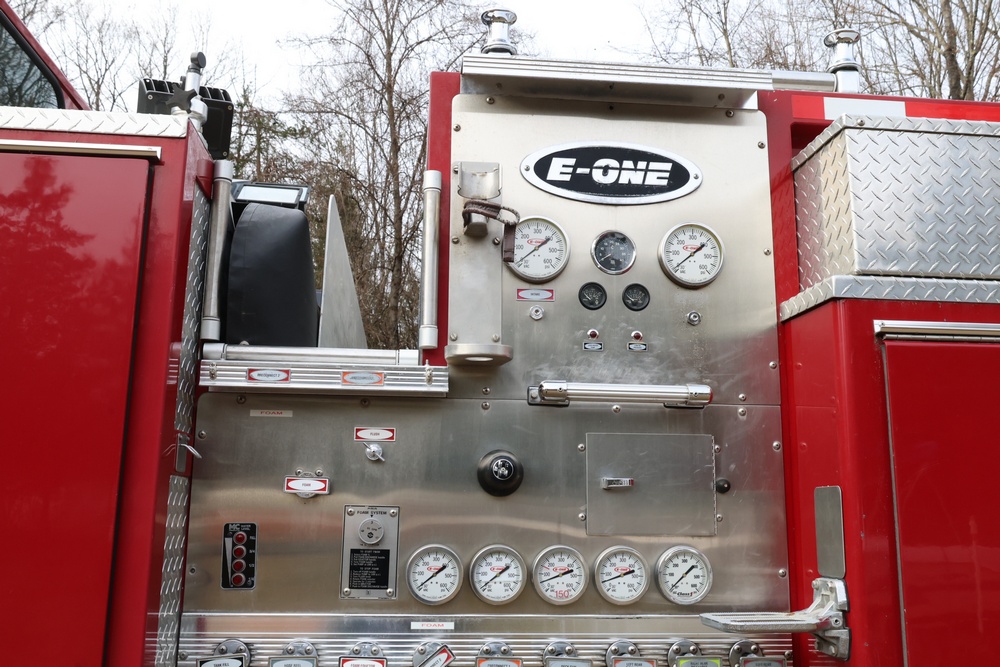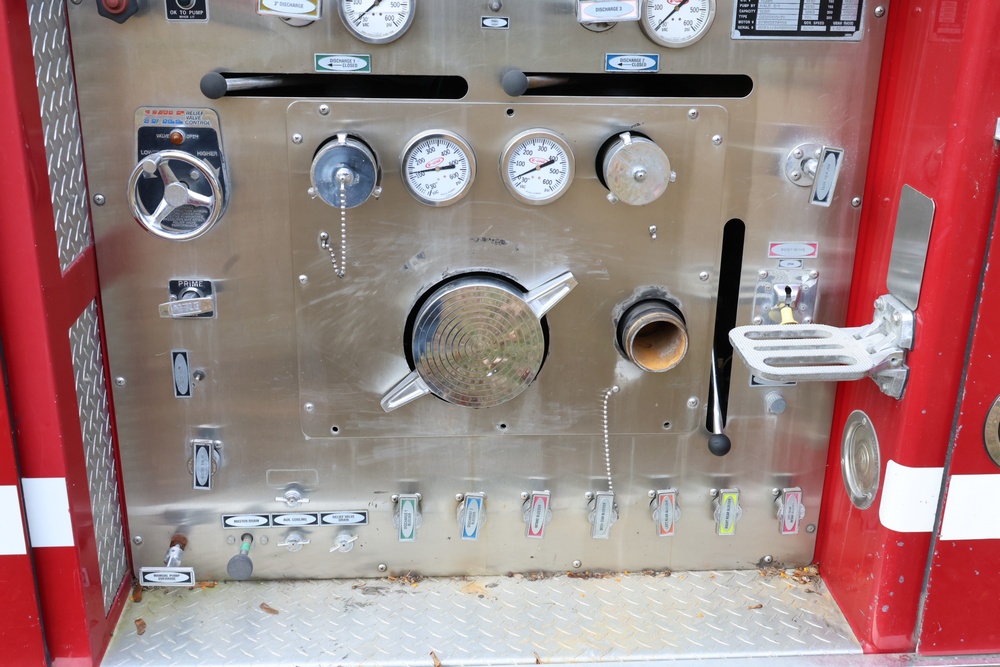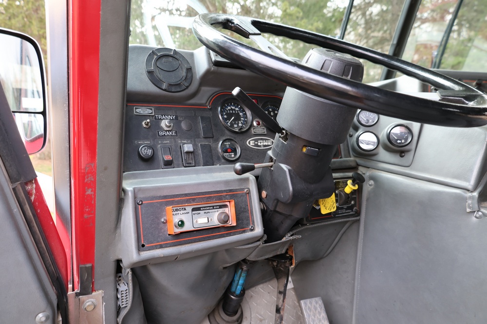 1994 E-One fire engine. VIN: 4ENFAAA84R1003394. Body: fire apparatus with full-size cab, side-mounted pump panel, and multiple exterior equipment compartments. Engine: Detroit Diesel 7.6L; fluid-capacity plate lists engine oil type SAE 15W-40 and coolant capacity 36 quarts. Odometer reading: 038933. Features include a Yamaha YG6600DE generator in a side compartment, roof-mounted Command Light Shadow RT (model SL445, year manufactured 2005), dual side mirrors, exterior scene lighting, front bumper with integrated hose connection, pump controls with multiple pressure and discharge gauges, and rear and side access compartments for firefighting equipment. Manufacturer label lists GVWR 38,400 lbs., GAWR front 14,600 lbs., GAWR rear 23,800 lbs., and manufacture date 4/94. Seller reports: runs and drives, title and key available. Battery may need to be replaced to start.