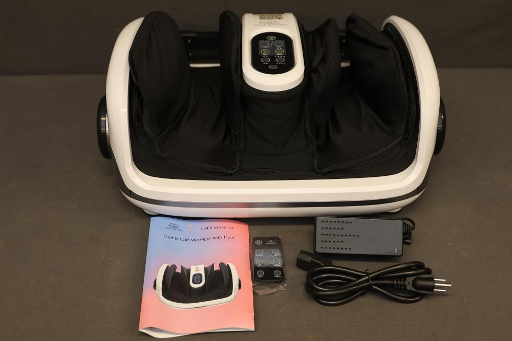 Cloud Massage Foot and Calf Massager with Heat. Includes massager unit, power adapter, and manual. Features adjustable intensity levels, heat therapy, and ergonomic design for foot and calf massage. Original box included with some wear. Pickup only.