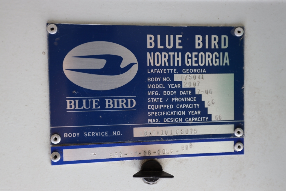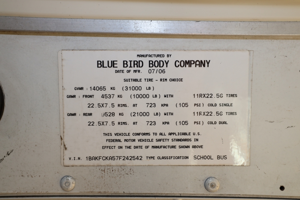 2007 Blue Bird Vision School Bus. VIN: 1BAKFCKA57F242542. Body: Commercial Bus 1D. Engine: CAT 7.2L I6 CRDI Diesel. Odometer reading: 124885. Seller reports: Operates. Title & key available.