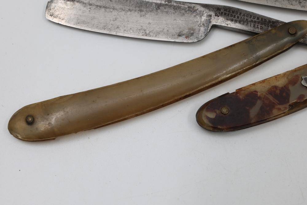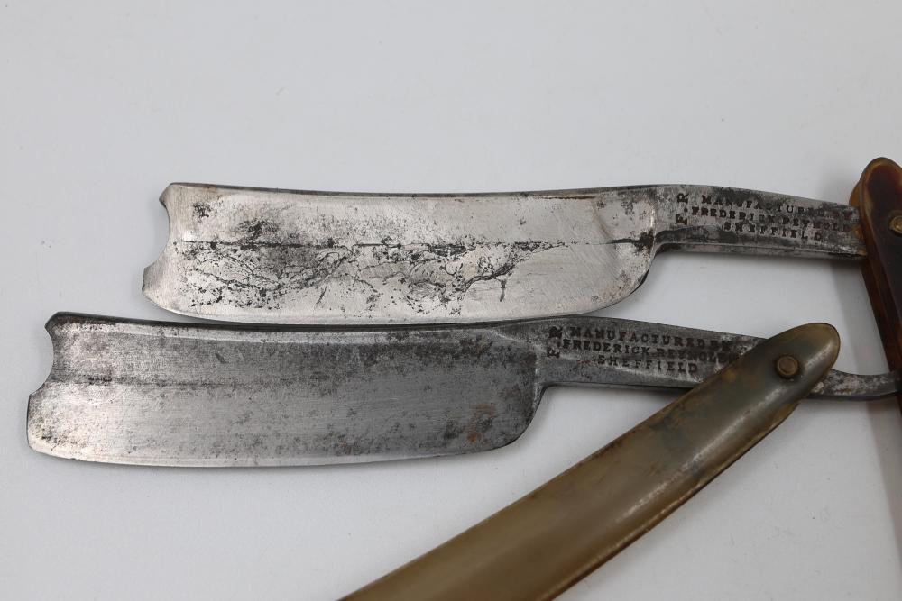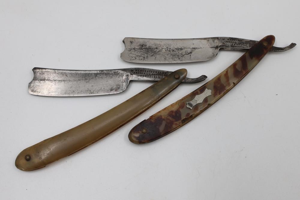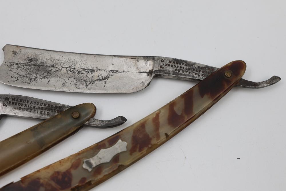 Four Frederick Reynolds Sheffield Straight Razors having horn and composite scales with notched wedge blades. Includes two formed cases. See photos for details. Pickup only.