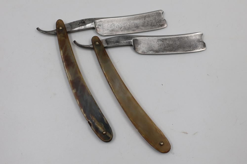 Items are from one straight razor collection & include cased matched pair of Joseph Rodgers & Sons straight razors having etched blade panels in velvet-lined Rodgers fitted case; Texas Luggage U.S. military style portable barber kit; porcelain shaving mugs with four lather brushes, collapsible compact travel shaving mirror with bowl; Warranted Razors having horn handles & notched Sheffield-style blades, etched Washington commemorative hollow blade with patriotic motif; Frederick Reynolds Sheffield straight razors; razors w/ mother of pearl scales/inlaid bar escutcheons/silver tone end caps/wedge-style blades; razors from Rogers & Sons, Wade & Butcher & Mappin's, featuring two horn scales & one celluloid with wedge style blades; razors from Clauss, J.A. Henckels, & H. Boker & Co., featuring mixed celluloid scales with hollow blades/includes multiple cases; barber Accessories including razor strops/sharpening stones/boxed Schick blades & more. Items are located in Pleasant Valley, NY.
