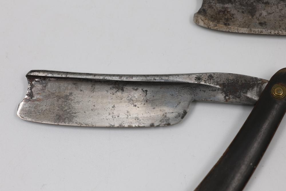 Items are from one straight razor collection & include cased matched pair of Joseph Rodgers & Sons straight razors having etched blade panels in velvet-lined Rodgers fitted case; Texas Luggage U.S. military style portable barber kit; porcelain shaving mugs with four lather brushes, collapsible compact travel shaving mirror with bowl; Warranted Razors having horn handles & notched Sheffield-style blades, etched Washington commemorative hollow blade with patriotic motif; Frederick Reynolds Sheffield straight razors; razors w/ mother of pearl scales/inlaid bar escutcheons/silver tone end caps/wedge-style blades; razors from Rogers & Sons, Wade & Butcher & Mappin's, featuring two horn scales & one celluloid with wedge style blades; razors from Clauss, J.A. Henckels, & H. Boker & Co., featuring mixed celluloid scales with hollow blades/includes multiple cases; barber Accessories including razor strops/sharpening stones/boxed Schick blades & more. Items are located in Pleasant Valley, NY.