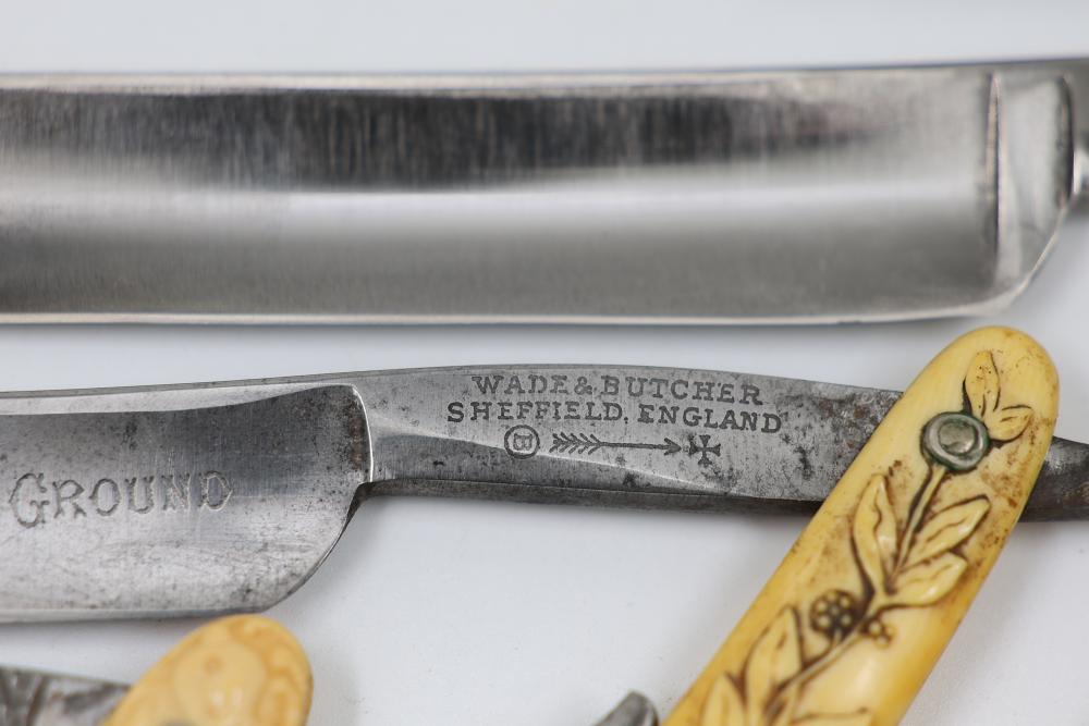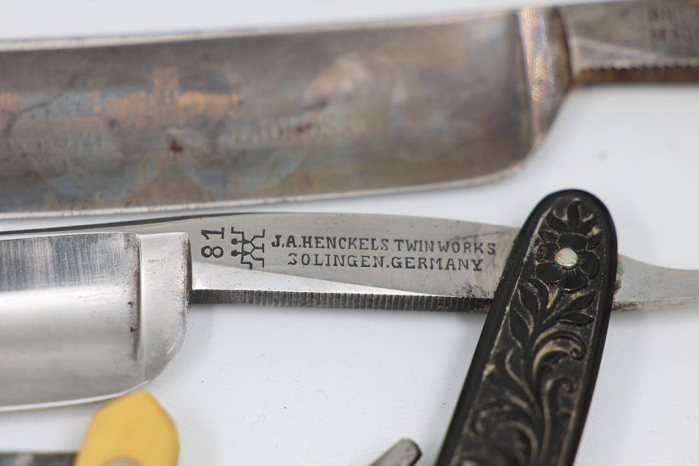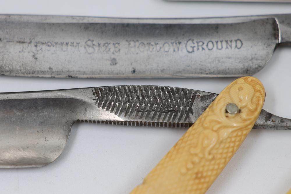 Items are from one straight razor collection & include cased matched pair of Joseph Rodgers & Sons straight razors having etched blade panels in velvet-lined Rodgers fitted case; Texas Luggage U.S. military style portable barber kit; porcelain shaving mugs with four lather brushes, collapsible compact travel shaving mirror with bowl; Warranted Razors having horn handles & notched Sheffield-style blades, etched Washington commemorative hollow blade with patriotic motif; Frederick Reynolds Sheffield straight razors; razors w/ mother of pearl scales/inlaid bar escutcheons/silver tone end caps/wedge-style blades; razors from Rogers & Sons, Wade & Butcher & Mappin's, featuring two horn scales & one celluloid with wedge style blades; razors from Clauss, J.A. Henckels, & H. Boker & Co., featuring mixed celluloid scales with hollow blades/includes multiple cases; barber Accessories including razor strops/sharpening stones/boxed Schick blades & more. Items are located in Pleasant Valley, NY.