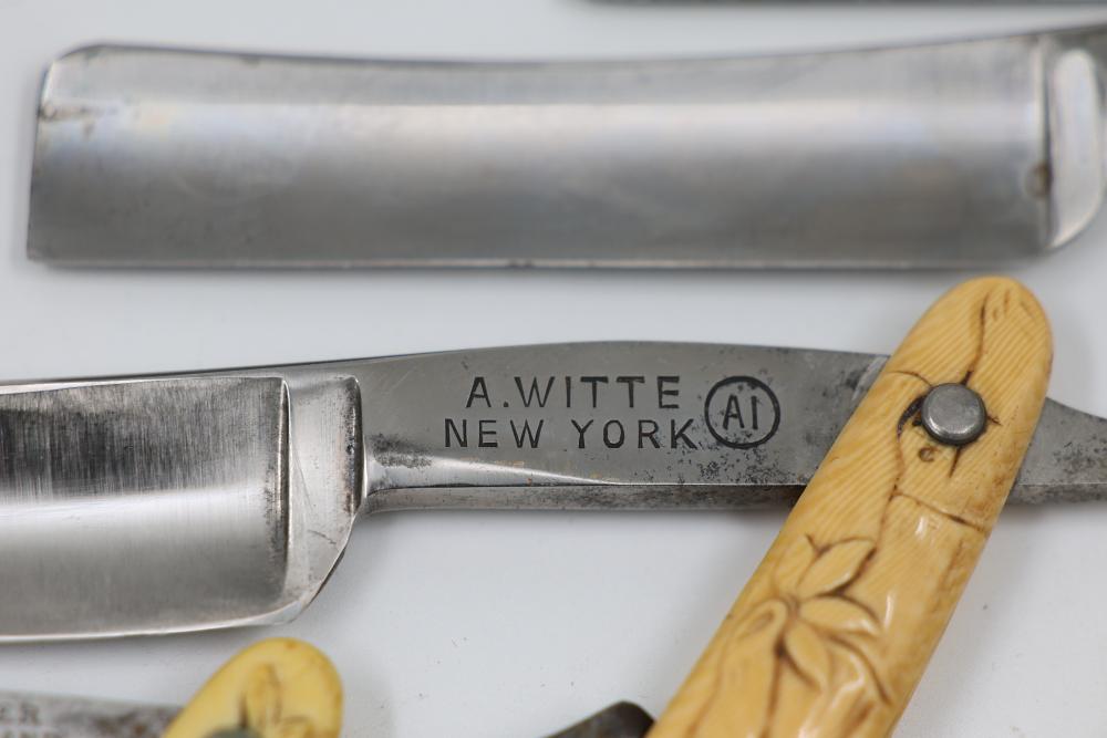 Eight Straight Razors from makers such as A. Witte, Antoni Tadross, and Wade & Butcher, featuring decorative celluloid handles with embossed and carved designs. Mixed full and hollow blades, some with etched eagle and scenic motifs. See photos for details. Pickup only.