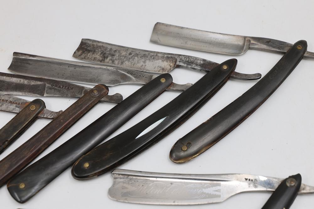 Items are from one straight razor collection & include cased matched pair of Joseph Rodgers & Sons straight razors having etched blade panels in velvet-lined Rodgers fitted case; Texas Luggage U.S. military style portable barber kit; porcelain shaving mugs with four lather brushes, collapsible compact travel shaving mirror with bowl; Warranted Razors having horn handles & notched Sheffield-style blades, etched Washington commemorative hollow blade with patriotic motif; Frederick Reynolds Sheffield straight razors; razors w/ mother of pearl scales/inlaid bar escutcheons/silver tone end caps/wedge-style blades; razors from Rogers & Sons, Wade & Butcher & Mappin's, featuring two horn scales & one celluloid with wedge style blades; razors from Clauss, J.A. Henckels, & H. Boker & Co., featuring mixed celluloid scales with hollow blades/includes multiple cases; barber Accessories including razor strops/sharpening stones/boxed Schick blades & more. Items are located in Pleasant Valley, NY.
