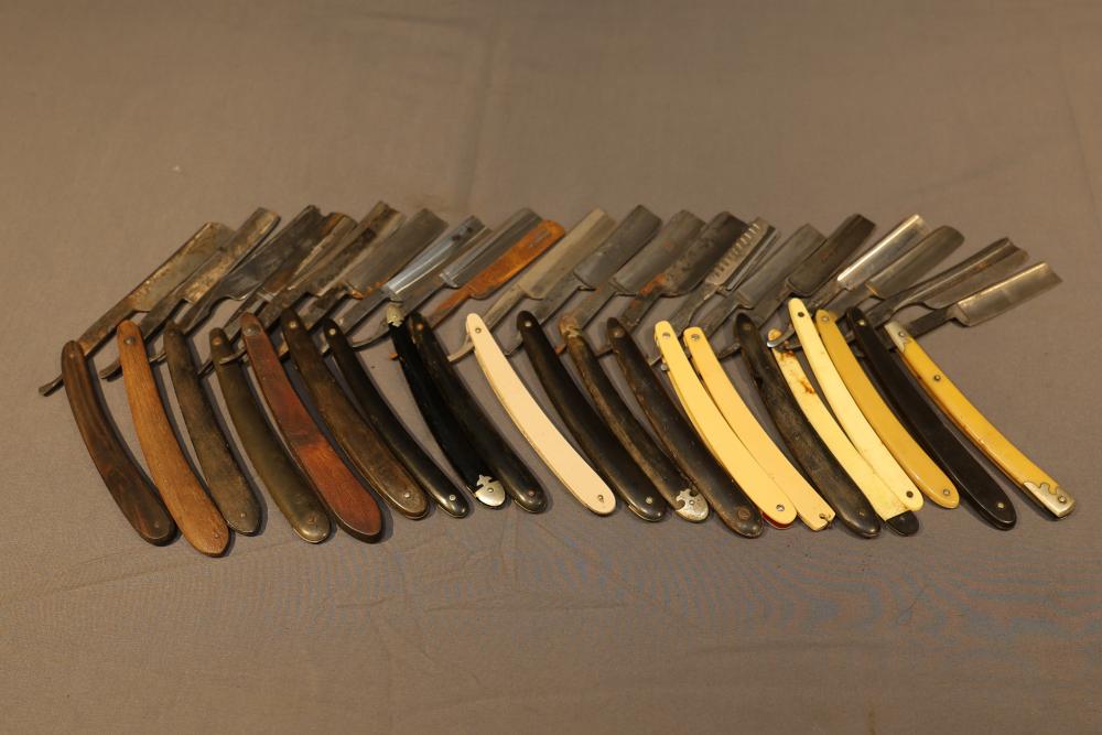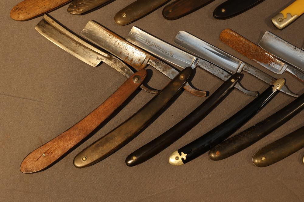 20 Straight Razors with makers marks such as Ontario Cutlery, Amendola Special, and Frederick Reynolds, featuring wood, horn, and celluloid scales, with mixed wedge style blades. See photos for details. Pickup only.