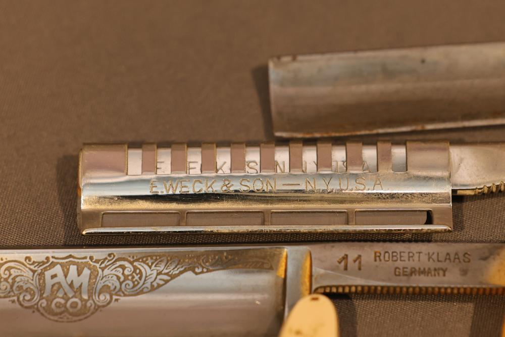 Items are from one straight razor collection & include cased matched pair of Joseph Rodgers & Sons straight razors having etched blade panels in velvet-lined Rodgers fitted case; Texas Luggage U.S. military style portable barber kit; porcelain shaving mugs with four lather brushes, collapsible compact travel shaving mirror with bowl; Warranted Razors having horn handles & notched Sheffield-style blades, etched Washington commemorative hollow blade with patriotic motif; Frederick Reynolds Sheffield straight razors; razors w/ mother of pearl scales/inlaid bar escutcheons/silver tone end caps/wedge-style blades; razors from Rogers & Sons, Wade & Butcher & Mappin's, featuring two horn scales & one celluloid with wedge style blades; razors from Clauss, J.A. Henckels, & H. Boker & Co., featuring mixed celluloid scales with hollow blades/includes multiple cases; barber Accessories including razor strops/sharpening stones/boxed Schick blades & more. Items are located in Pleasant Valley, NY.
