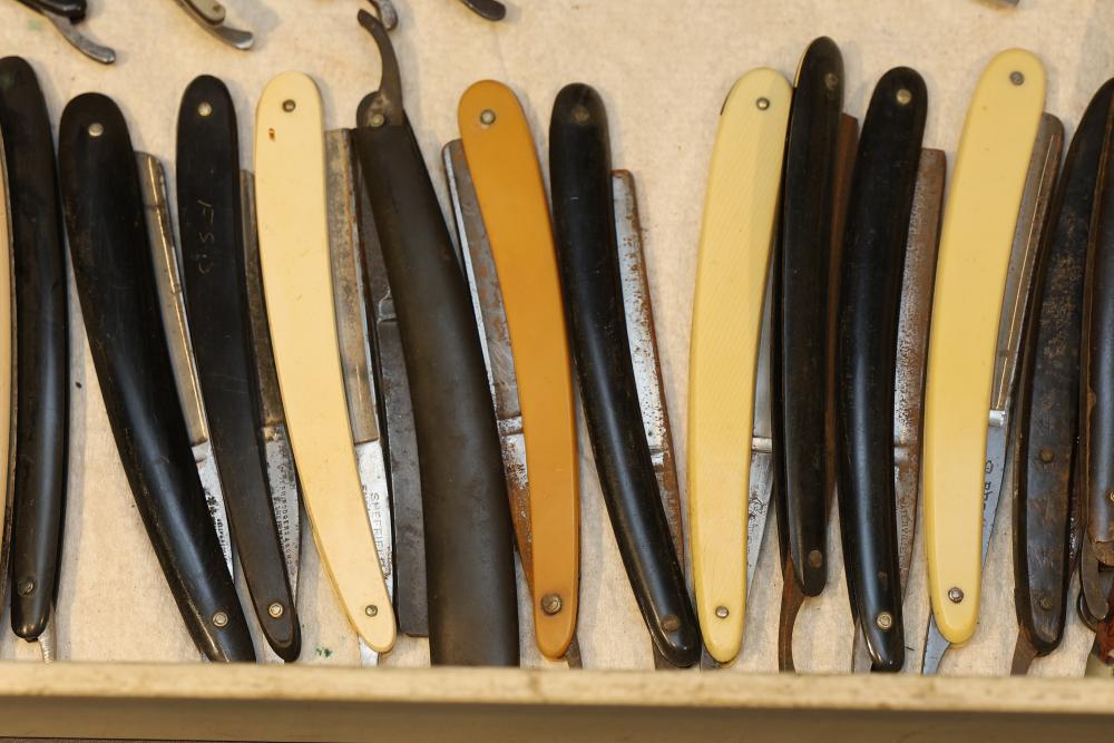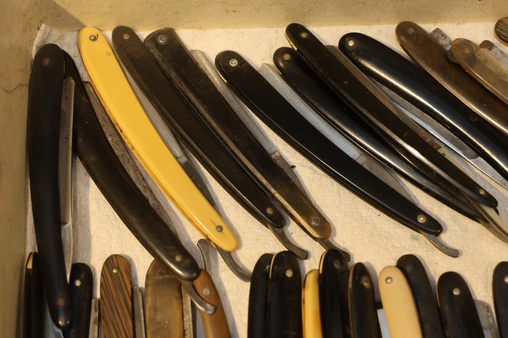 50 Straight Razors from many different makers such as J.R. Torrey, W.R. Case, and M.E. Reppenhagen, featuring horn and celluloid scales, with mixed wedge blades. One has a mother of pearl blade end. See photos for details. Pickup only.