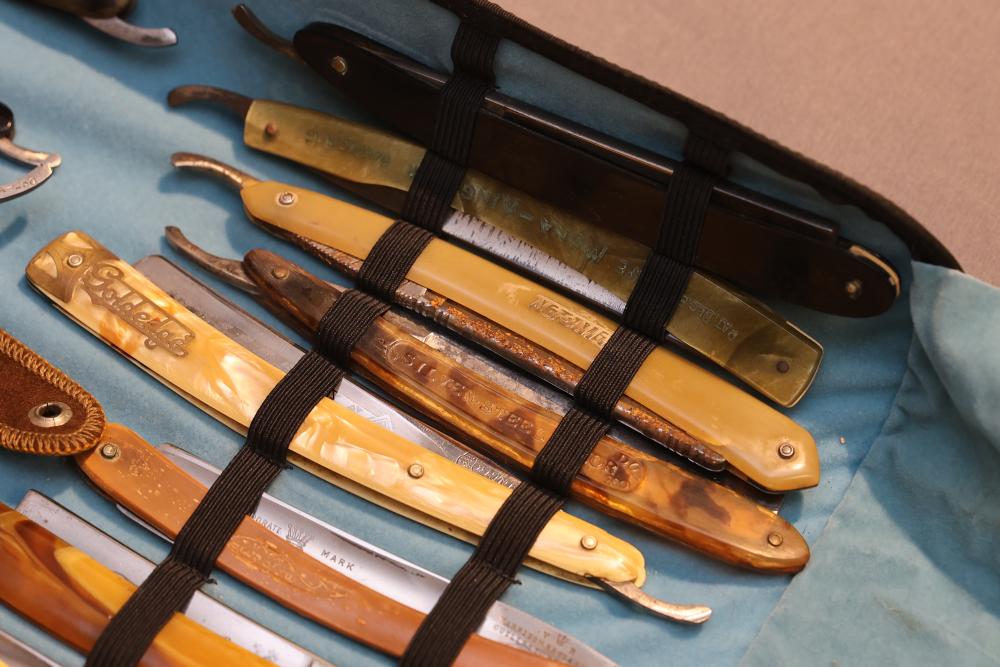 Items are from one straight razor collection & include cased matched pair of Joseph Rodgers & Sons straight razors having etched blade panels in velvet-lined Rodgers fitted case; Texas Luggage U.S. military style portable barber kit; porcelain shaving mugs with four lather brushes, collapsible compact travel shaving mirror with bowl; Warranted Razors having horn handles & notched Sheffield-style blades, etched Washington commemorative hollow blade with patriotic motif; Frederick Reynolds Sheffield straight razors; razors w/ mother of pearl scales/inlaid bar escutcheons/silver tone end caps/wedge-style blades; razors from Rogers & Sons, Wade & Butcher & Mappin's, featuring two horn scales & one celluloid with wedge style blades; razors from Clauss, J.A. Henckels, & H. Boker & Co., featuring mixed celluloid scales with hollow blades/includes multiple cases; barber Accessories including razor strops/sharpening stones/boxed Schick blades & more. Items are located in Pleasant Valley, NY.
