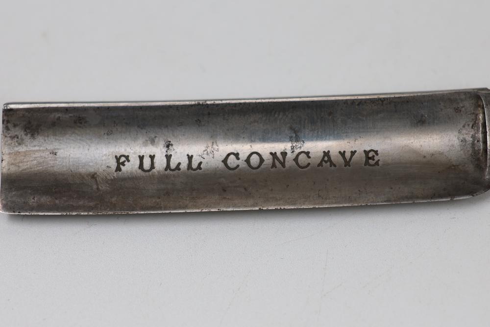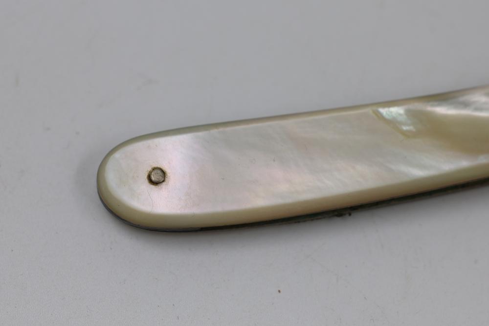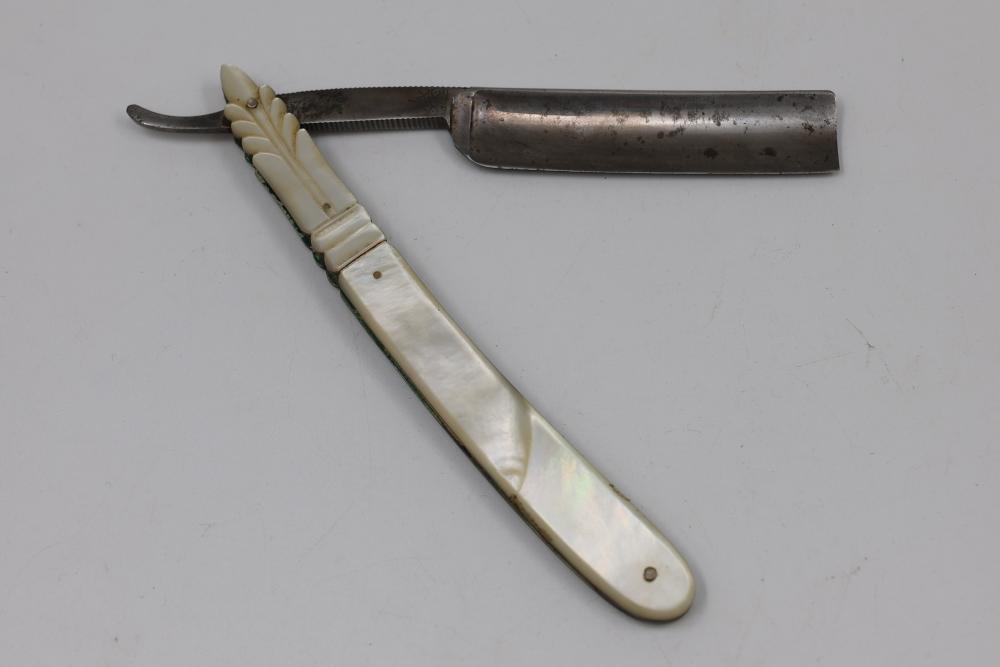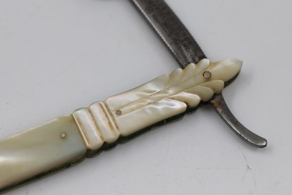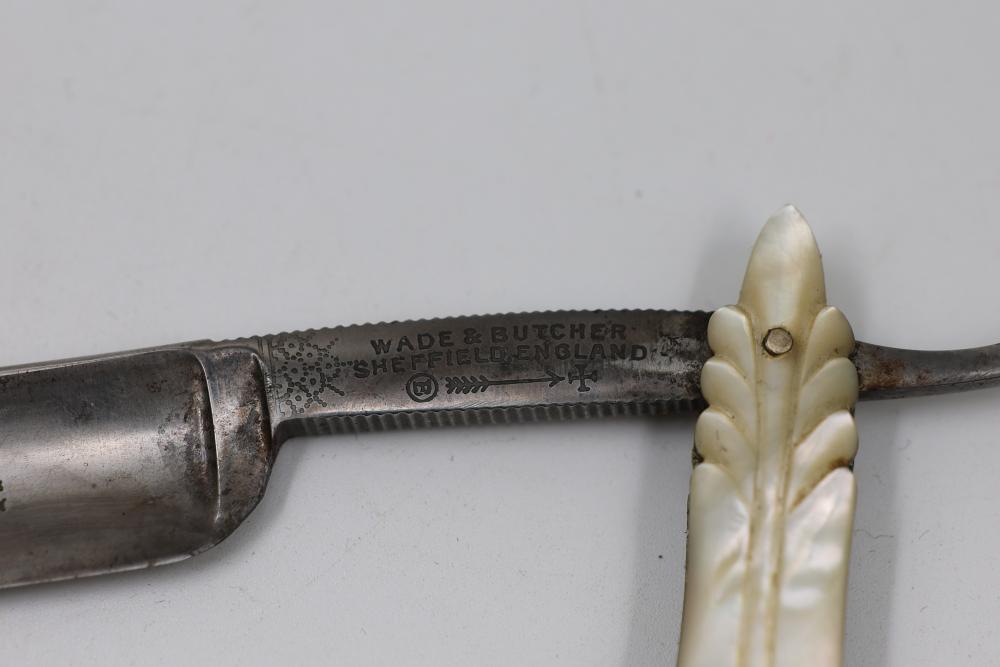 Wade & Butcher straight razor having fully concave blade and carved mother-of-pearl scales with decorative escutcheon motif. Pickup only.