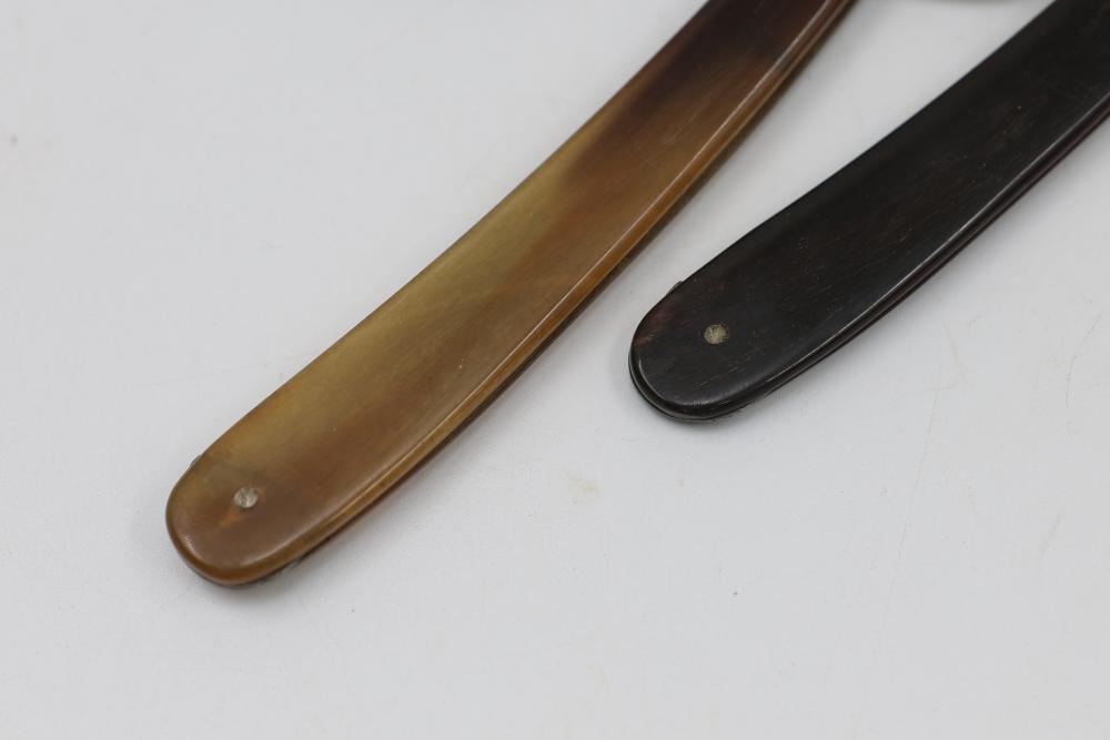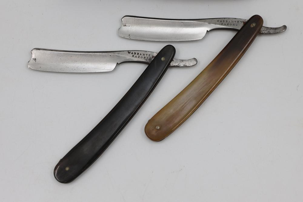 Pair of Straight Razors marked Warranted Razors having horn handles and notched Sheffield-style blades, including a two slot wedge case. Pickup only.