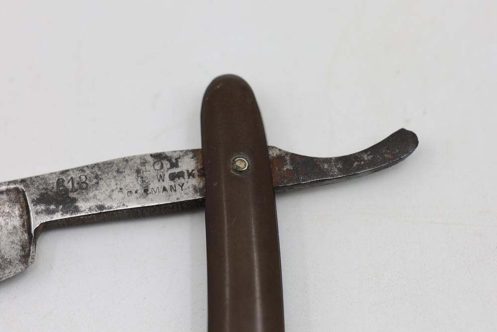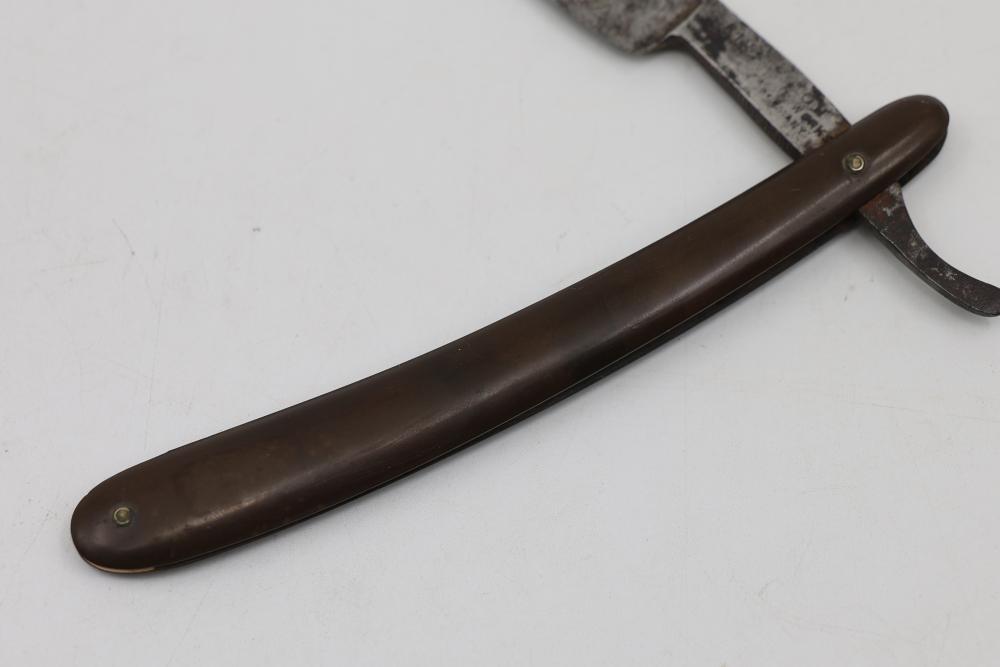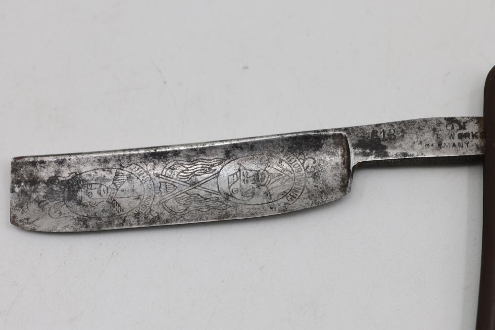 Straight Razor with etched motifs portraying Theodore Roosevelt and General Botha having a hollow blade and a celluloid scale. Pickup only.