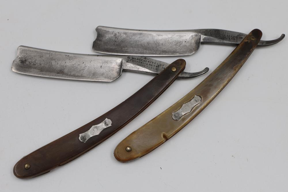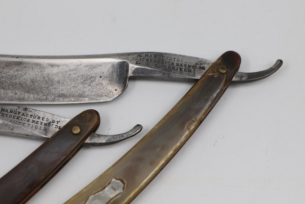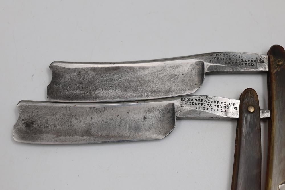 Four Frederick Reynolds Sheffield Straight Razors having horn and composite scales with notched wedge blades. Includes two formed cases. Pickup only.