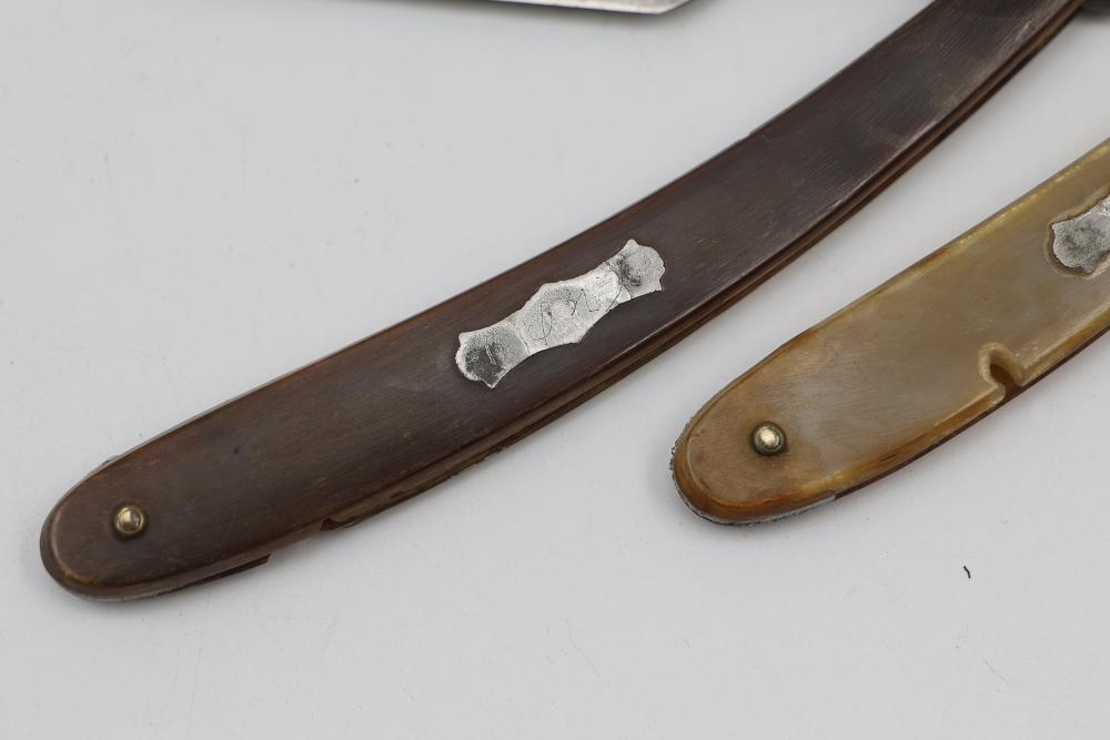 Items are from one straight razor collection & include cased matched pair of Joseph Rodgers & Sons straight razors having etched blade panels in velvet-lined Rodgers fitted case; etched motif Theodore Roosevelt & General Botha straight razor; Texas Luggage U.S. military style portable barber kit; porcelain shaving mugs with four lather brushes, collapsible compact travel shaving mirror with bowl; Warranted Razors having horn handles & notched Sheffield-style blades, etched Washington commemorative hollow blade with patriotic motif; Frederick Reynolds Sheffield straight razors; razors w/ mother of pearl scales/inlaid bar escutcheons/silver tone end caps/wedge-style blades; razors from Rogers & Sons, Wade & Butcher & Mappin's, featuring two horn scales & one celluloid with wedge style blades; razors from Clauss, J.A. Henckels, & H. Boker & Co., featuring mixed celluloid scales with hollow blades/includes multiple cases; barber accessories including razor strops/sharpening stones/boxed Schick blades; hair shapers; identification & value books & more. Items are located in Pleasant Valley, NY.