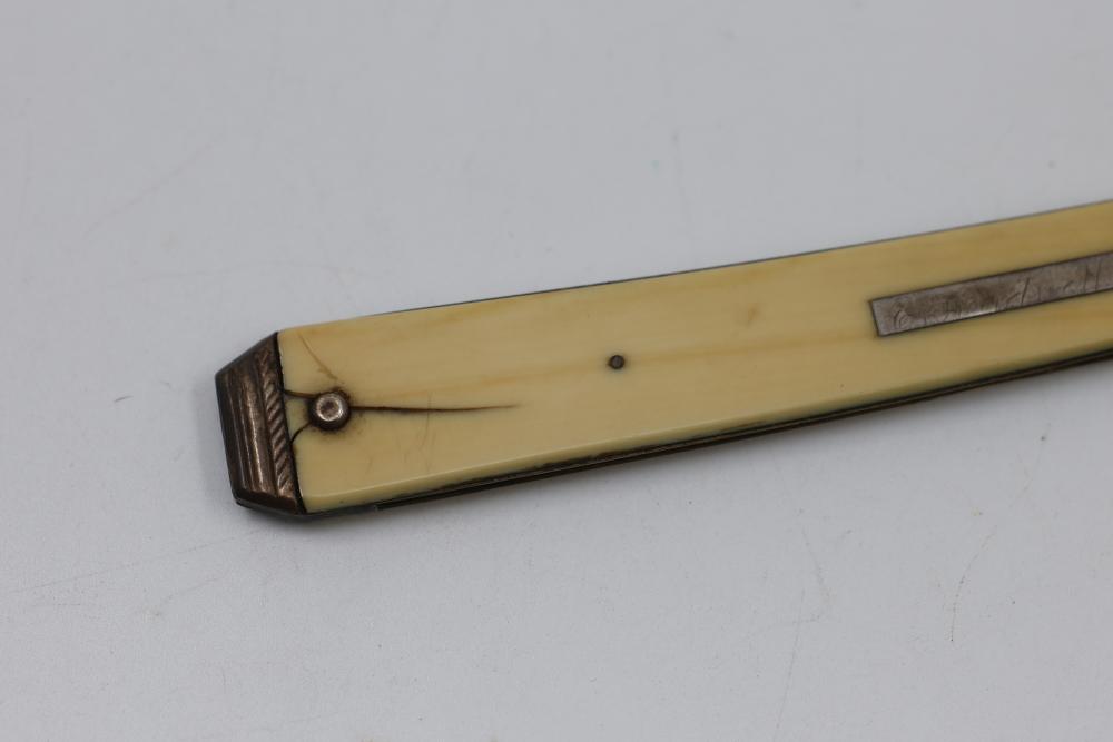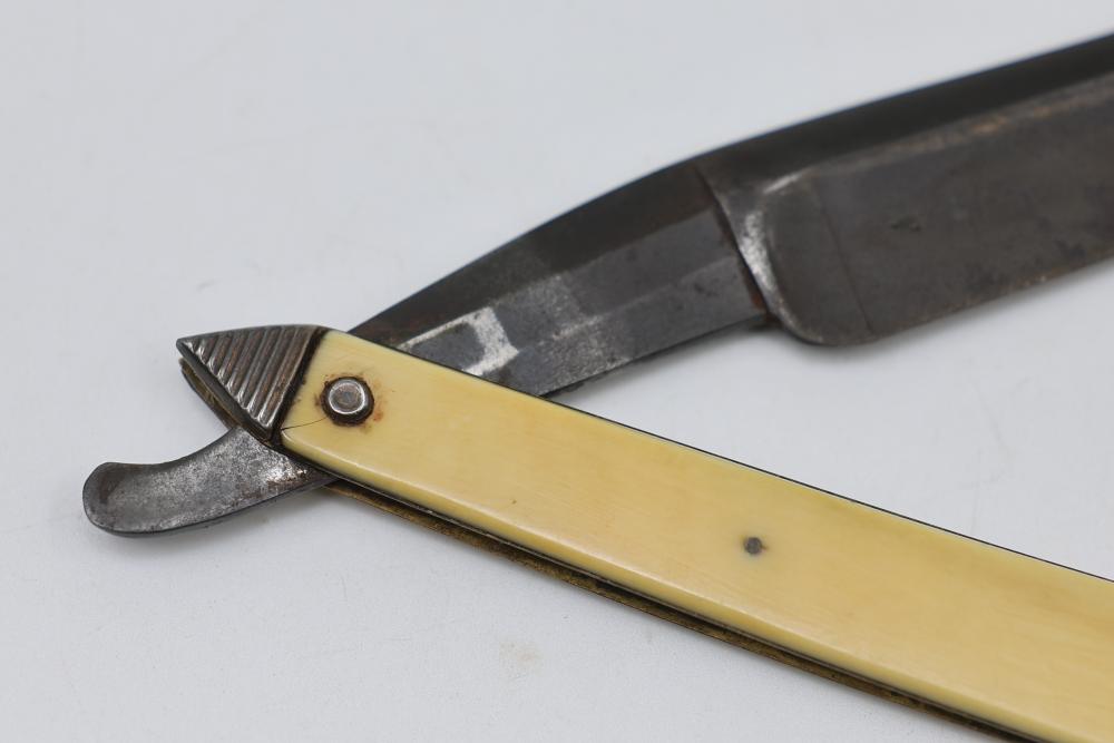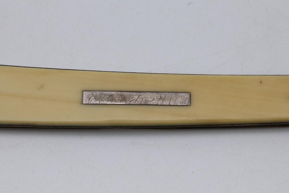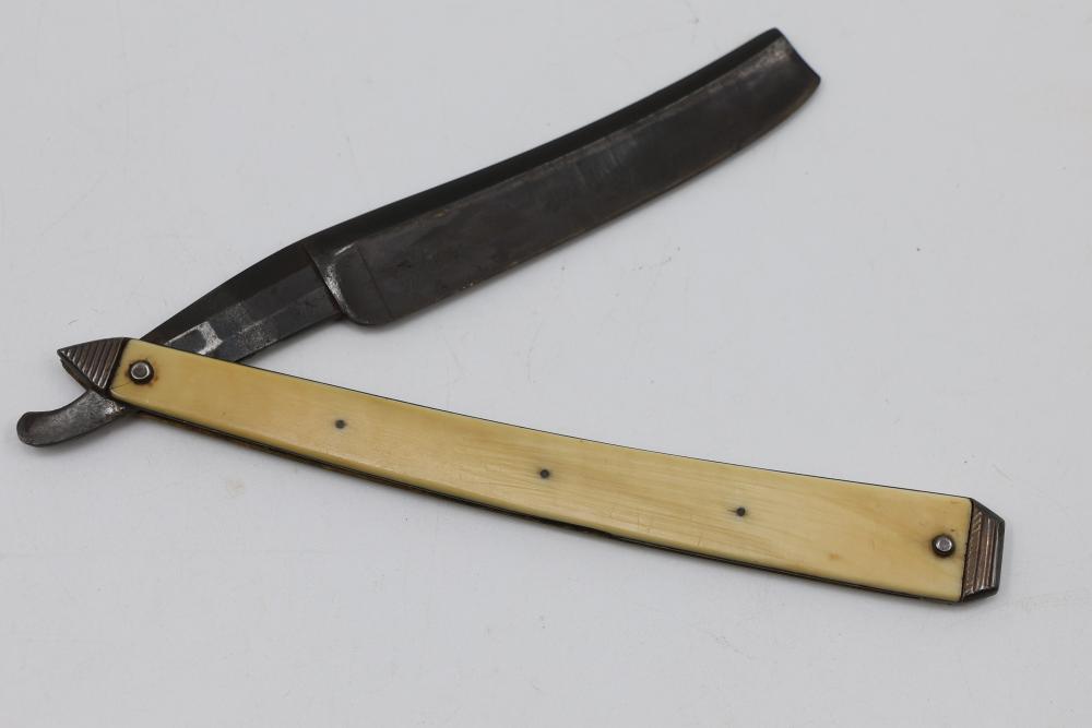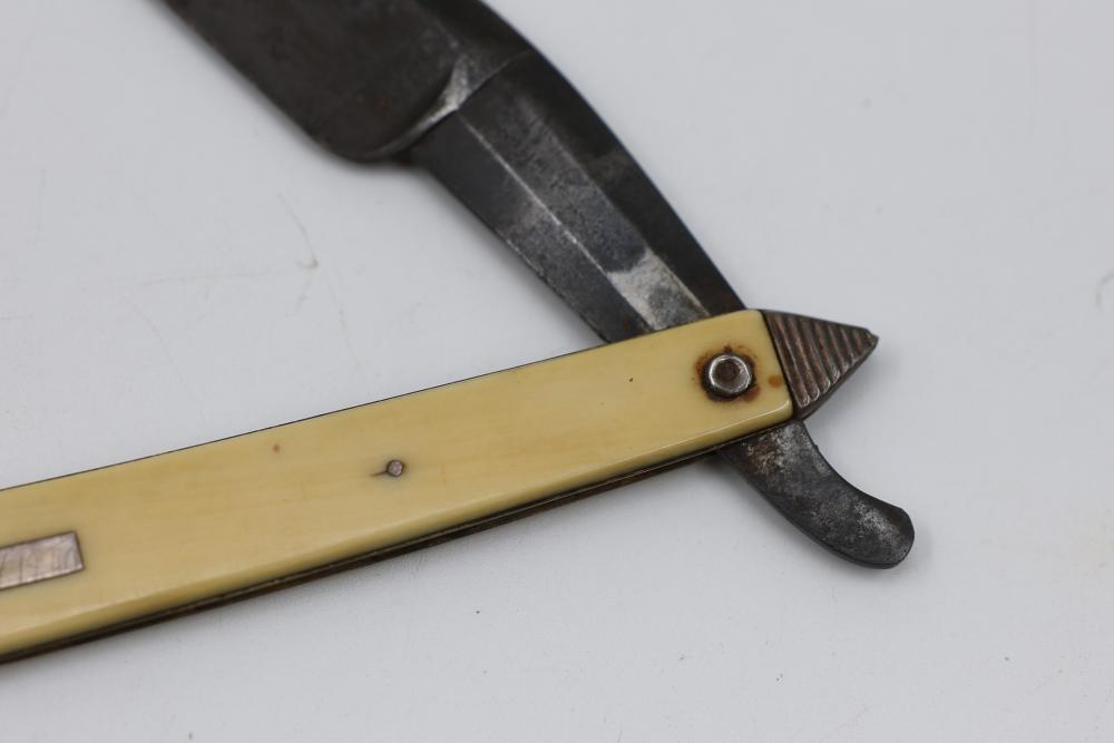 Straight Razor with tapered natural-toned scales with geometric end caps and an inset plate with an illegible signature and 1840 etched in, featuring a wedge-style blade and illegible makers mark. Pickup only.