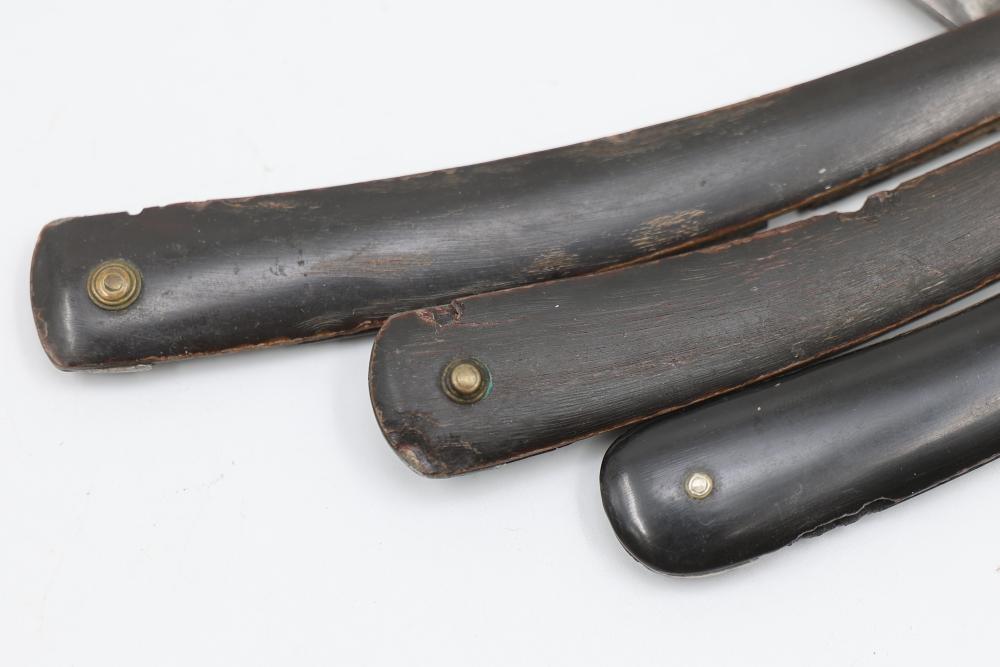 Three Straight Razors from makers Joseph Rogers & Sons, Wade & Butcher, and Mappin's, featuring two horn scales and one celluloid with wedge style blades. Includes a Rodgers marked case. Pickup only.