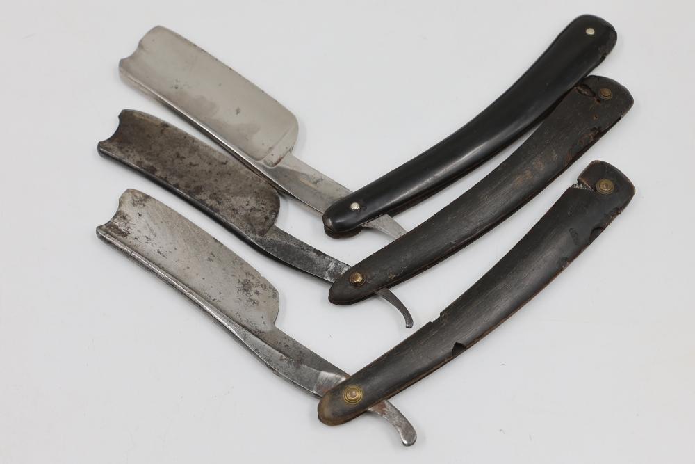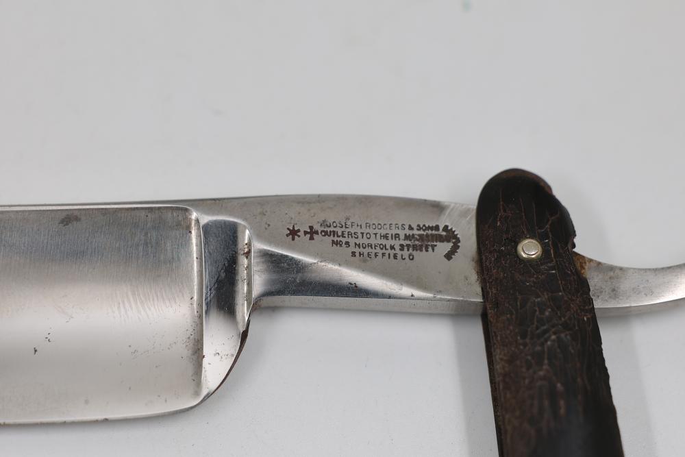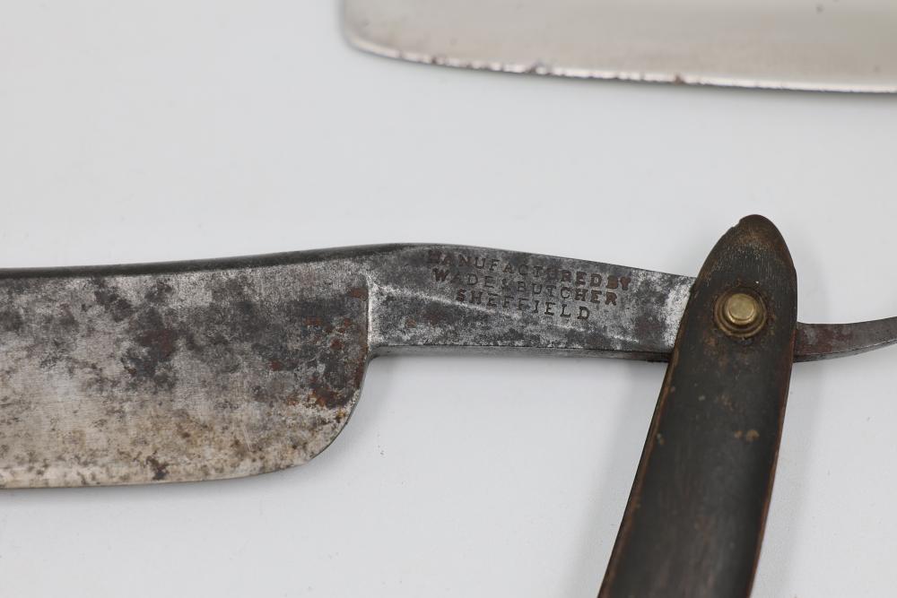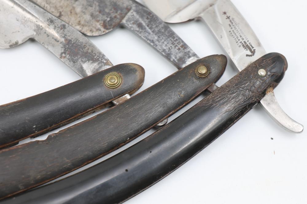 Items are from one straight razor collection & include cased matched pair of Joseph Rodgers & Sons straight razors having etched blade panels in velvet-lined Rodgers fitted case; etched motif Theodore Roosevelt & General Botha straight razor; Texas Luggage U.S. military style portable barber kit; porcelain shaving mugs with four lather brushes, collapsible compact travel shaving mirror with bowl; Warranted Razors having horn handles & notched Sheffield-style blades, etched Washington commemorative hollow blade with patriotic motif; Frederick Reynolds Sheffield straight razors; razors w/ mother of pearl scales/inlaid bar escutcheons/silver tone end caps/wedge-style blades; razors from Rogers & Sons, Wade & Butcher & Mappin's, featuring two horn scales & one celluloid with wedge style blades; razors from Clauss, J.A. Henckels, & H. Boker & Co., featuring mixed celluloid scales with hollow blades/includes multiple cases; barber accessories including razor strops/sharpening stones/boxed Schick blades; hair shapers; identification & value books & more. Items are located in Pleasant Valley, NY.