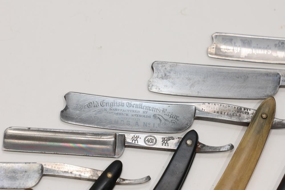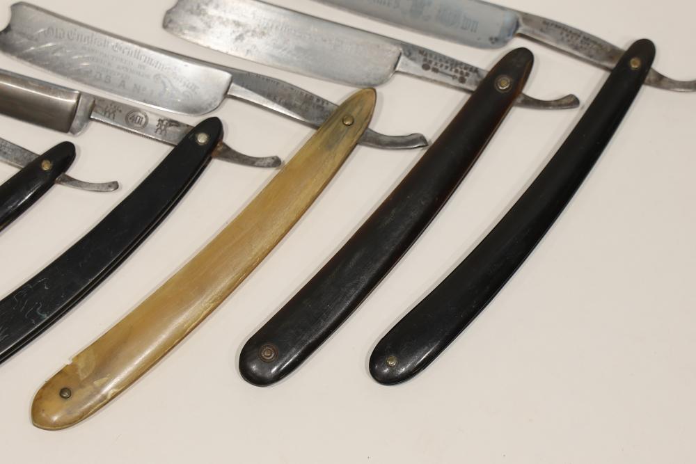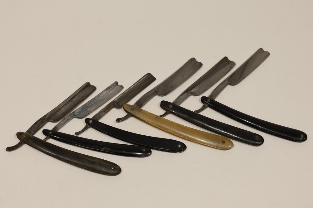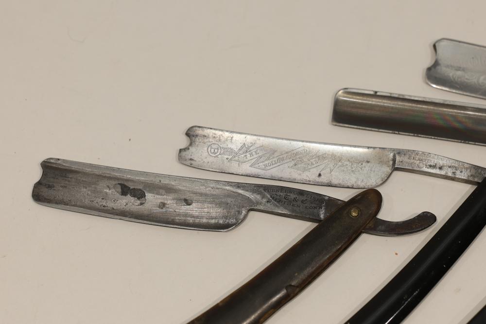Six Straight Razors from makers such as Frederick Reynolds, Wade & Butcher, and J.A.Henckels Twinworks having celluloid and bone scales with hollow and wedge blades, some having engraved motifs. Pickup only.