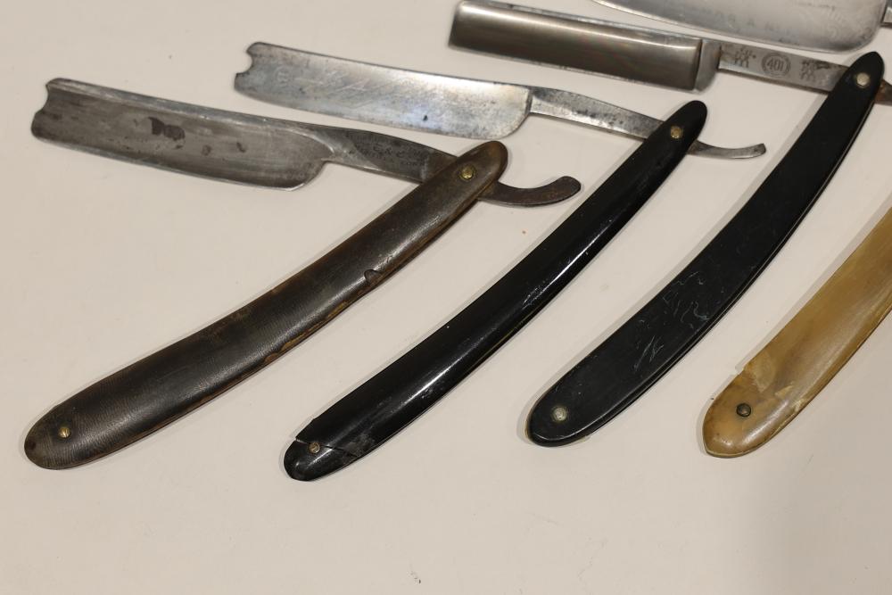 Items are from one straight razor collection & include cased matched pair of Joseph Rodgers & Sons straight razors having etched blade panels in velvet-lined Rodgers fitted case; etched motif Theodore Roosevelt & General Botha straight razor; Texas Luggage U.S. military style portable barber kit; porcelain shaving mugs with four lather brushes, collapsible compact travel shaving mirror with bowl; Warranted Razors having horn handles & notched Sheffield-style blades, etched Washington commemorative hollow blade with patriotic motif; Frederick Reynolds Sheffield straight razors; razors w/ mother of pearl scales/inlaid bar escutcheons/silver tone end caps/wedge-style blades; razors from Rogers & Sons, Wade & Butcher & Mappin's, featuring two horn scales & one celluloid with wedge style blades; razors from Clauss, J.A. Henckels, & H. Boker & Co., featuring mixed celluloid scales with hollow blades/includes multiple cases; barber accessories including razor strops/sharpening stones/boxed Schick blades; hair shapers; identification & value books & more. Items are located in Pleasant Valley, NY.