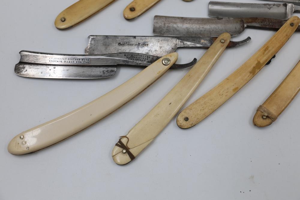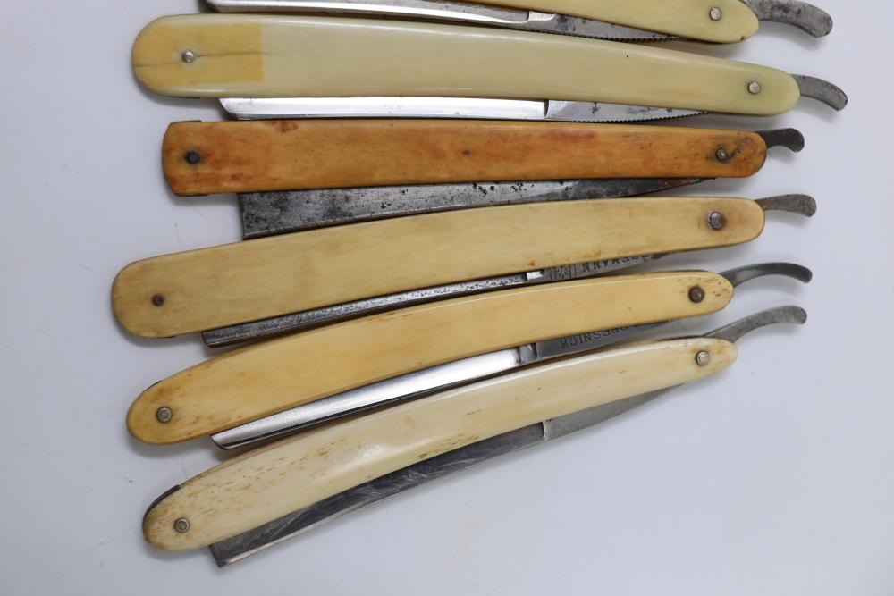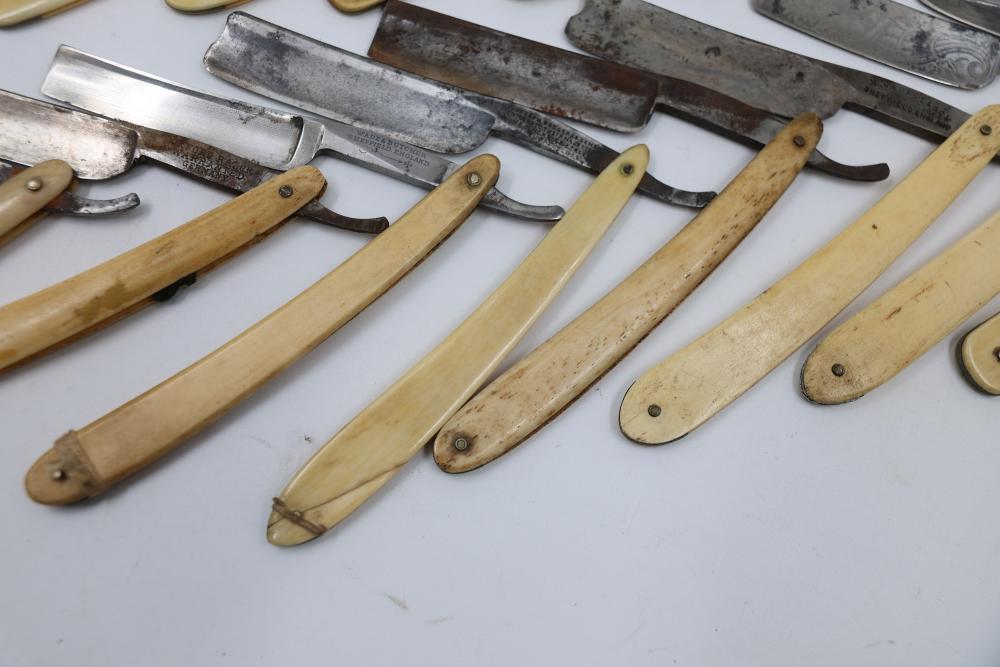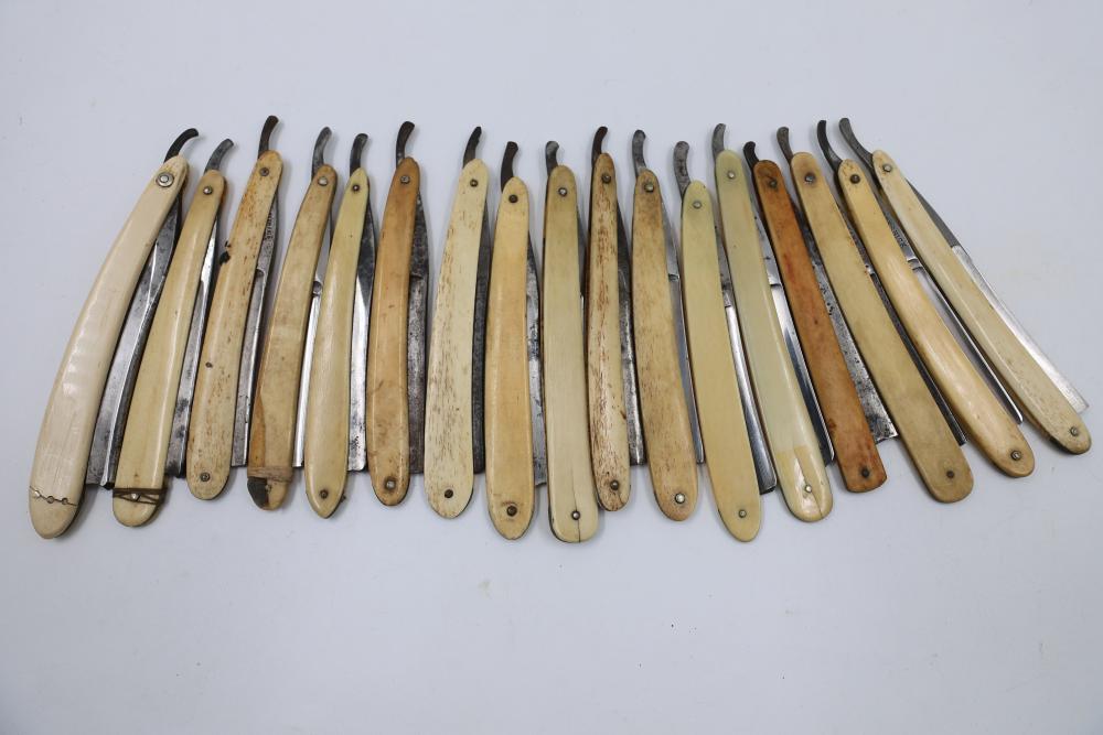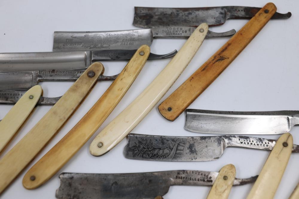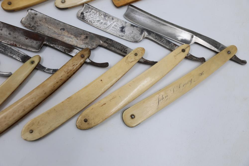 17 Straight Razors from makers such as Wade & Butcher, Joseph Rodgers, and Frederick Reynolds, featuring smooth and carved scales in natural tones, mixed wedge and hollow-ground blades, several with etched and specialty-patterns. One is labeled "Black Diamond" by C.S. Bresnick. Pickup only.