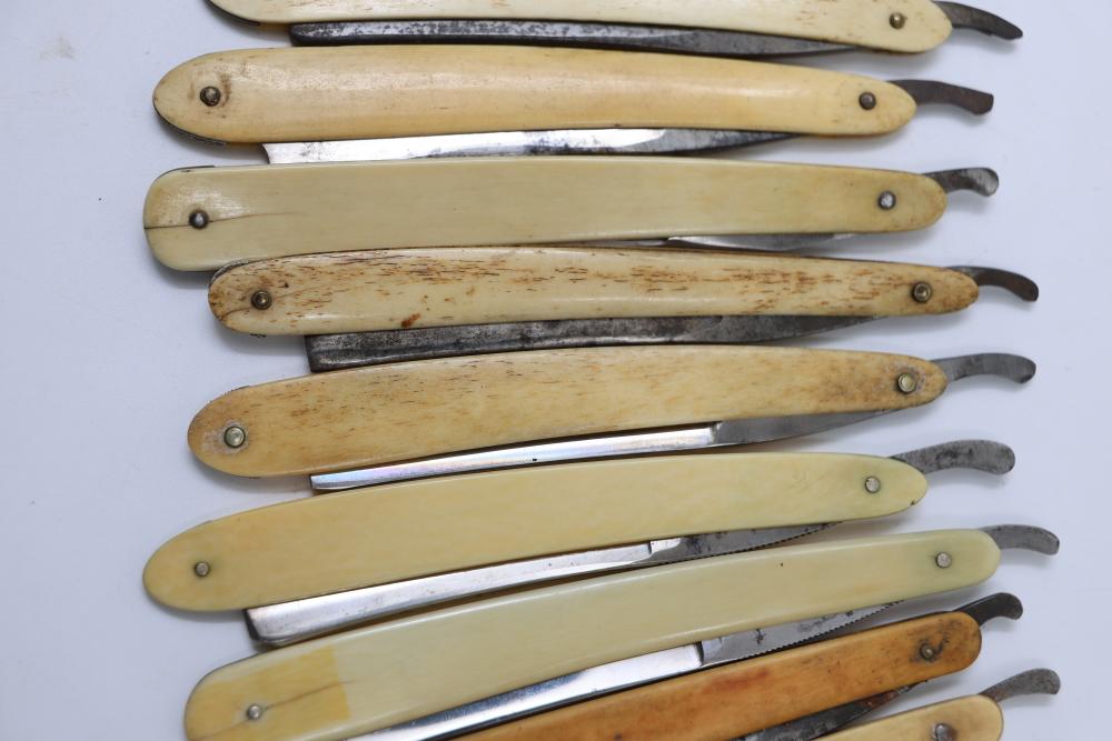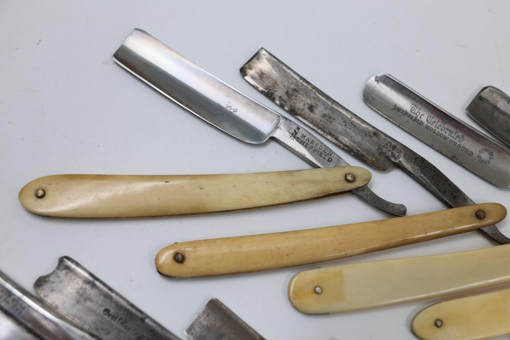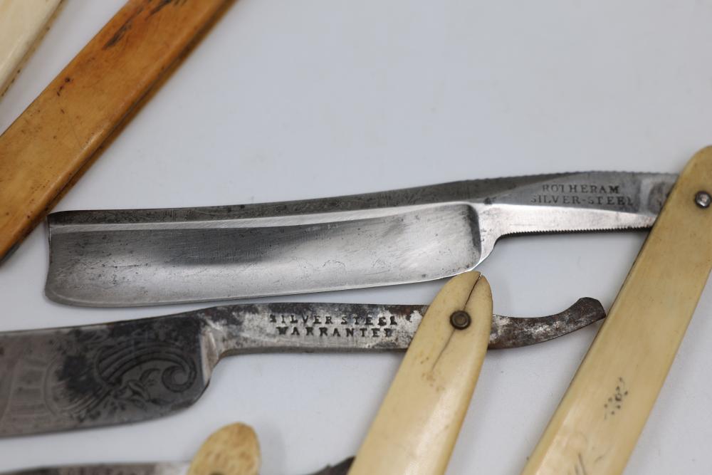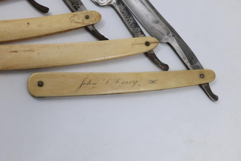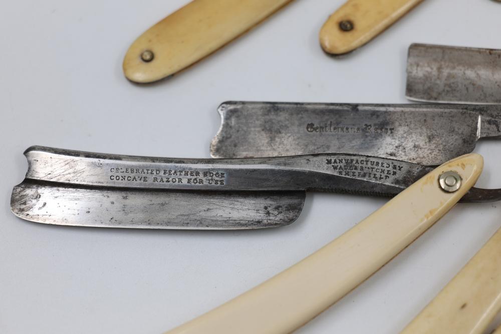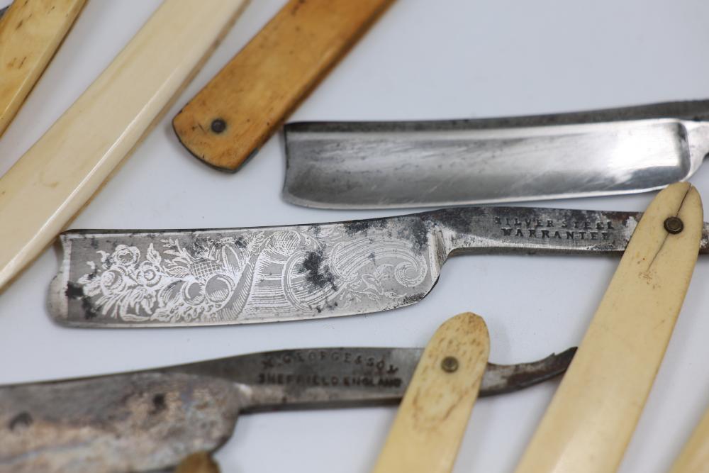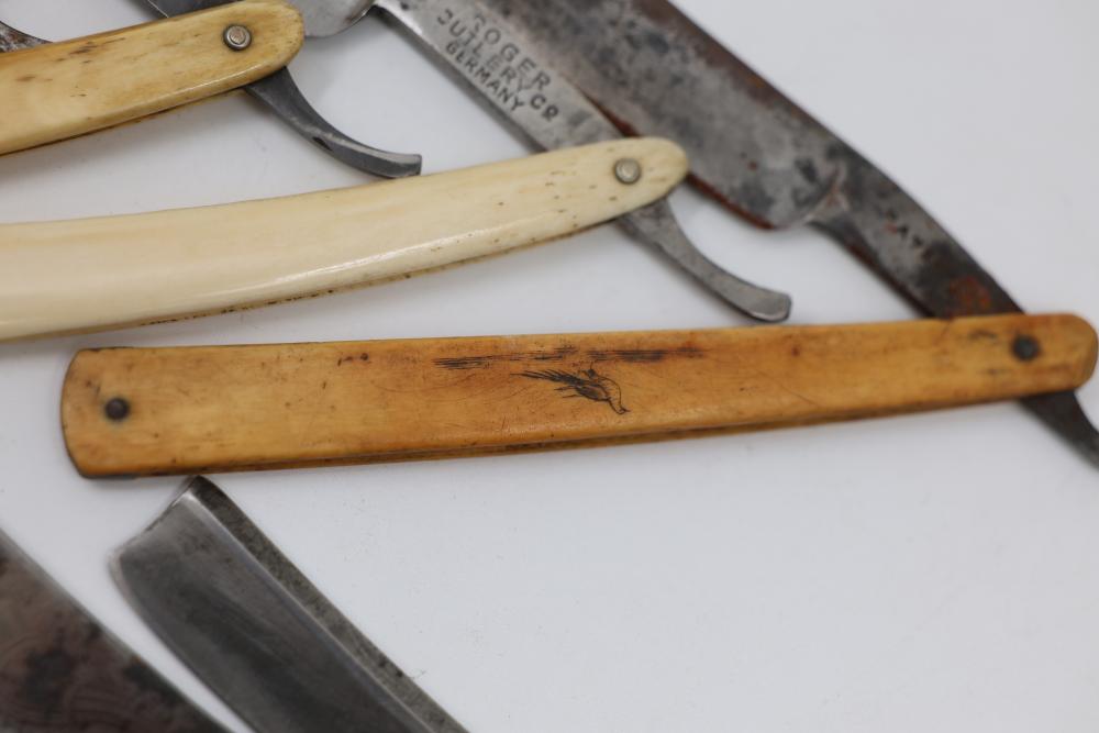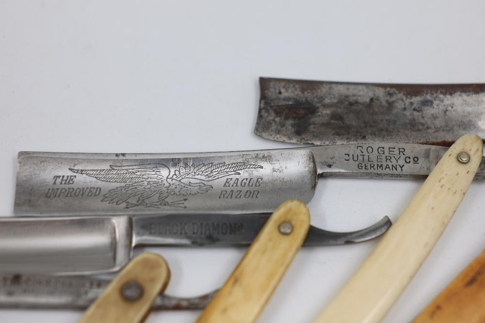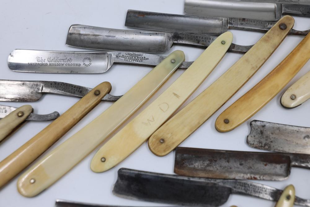 Items are from one straight razor collection & include cased matched pair of Joseph Rodgers & Sons straight razors having etched blade panels in velvet-lined Rodgers fitted case; etched motif Theodore Roosevelt & General Botha straight razor; Texas Luggage U.S. military style portable barber kit; porcelain shaving mugs with four lather brushes, collapsible compact travel shaving mirror with bowl; Warranted Razors having horn handles & notched Sheffield-style blades, etched Washington commemorative hollow blade with patriotic motif; Frederick Reynolds Sheffield straight razors; razors w/ mother of pearl scales/inlaid bar escutcheons/silver tone end caps/wedge-style blades; razors from Rogers & Sons, Wade & Butcher & Mappin's, featuring two horn scales & one celluloid with wedge style blades; razors from Clauss, J.A. Henckels, & H. Boker & Co., featuring mixed celluloid scales with hollow blades/includes multiple cases; barber accessories including razor strops/sharpening stones/boxed Schick blades; hair shapers; identification & value books & more. Items are located in Pleasant Valley, NY.