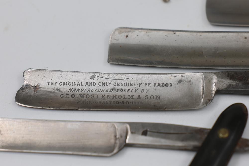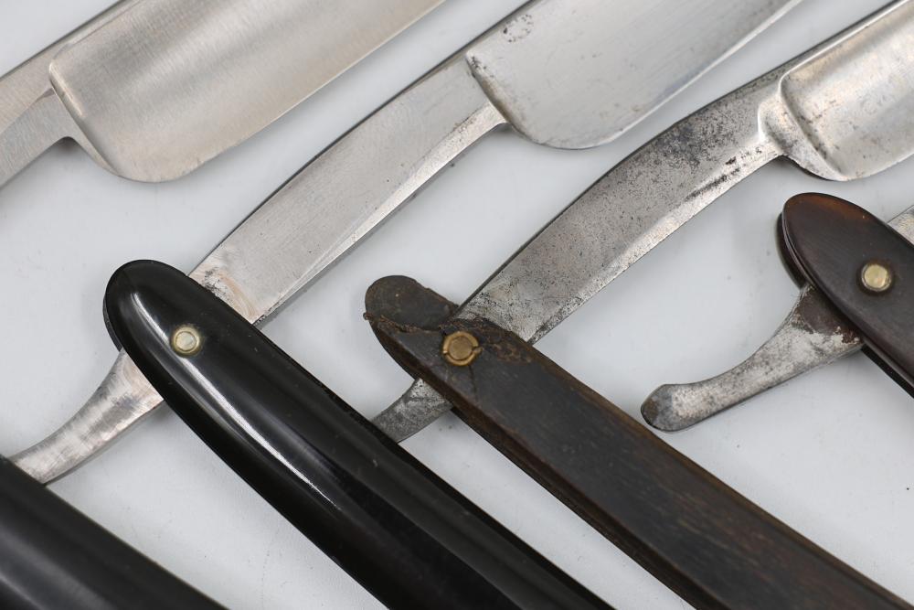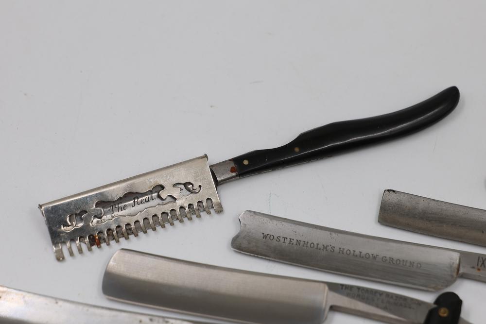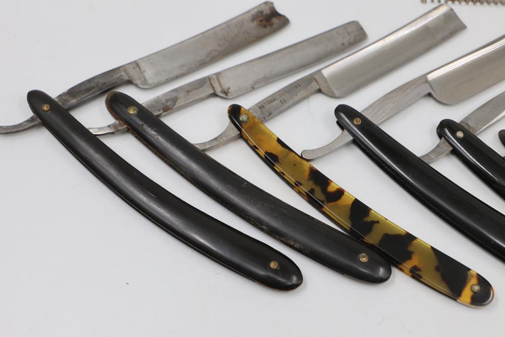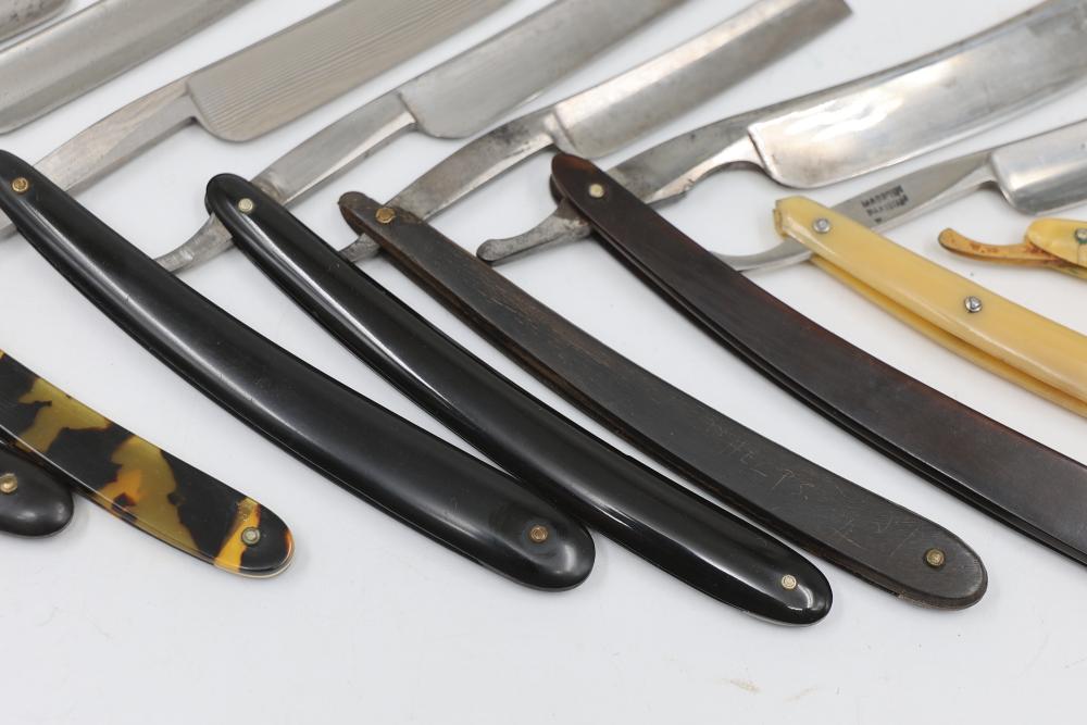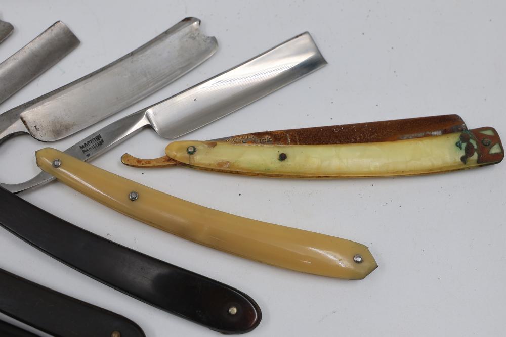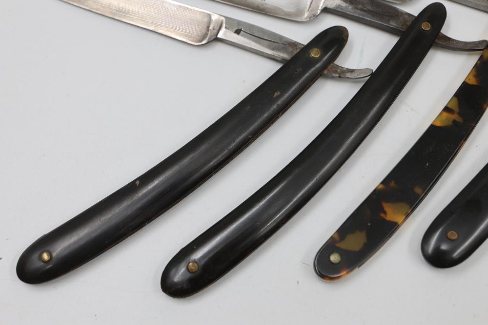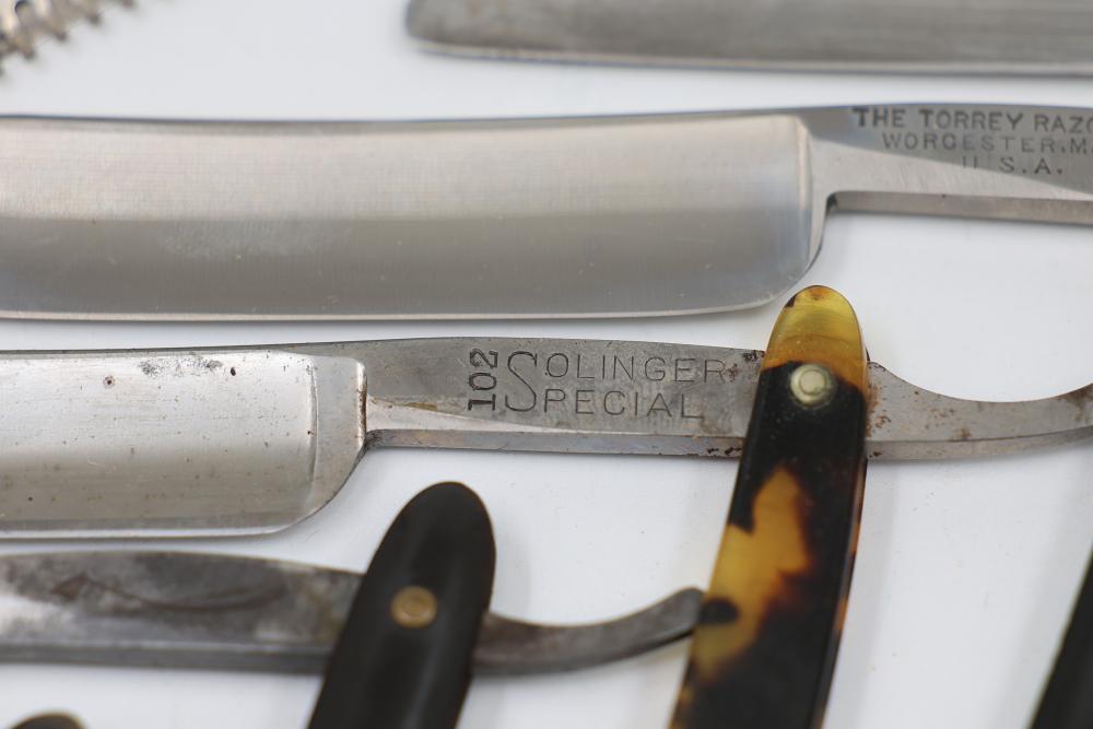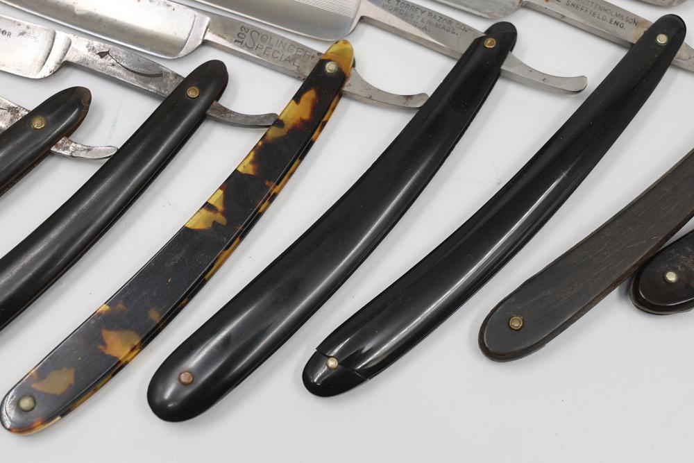 Ten Straight Razors with makers such as Geroge Wostenholm, The Torrey Razor Co., and Frederick Reynolds, featuring horn and celluloid scales, hollow, and near-wedge blades. Includes additional cases. Pickup only.