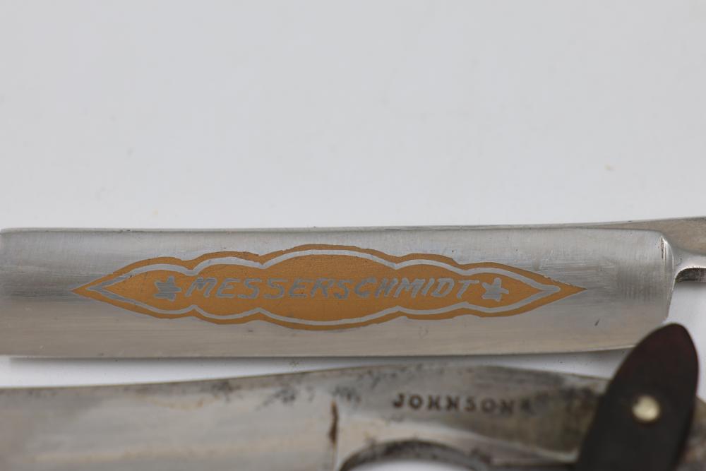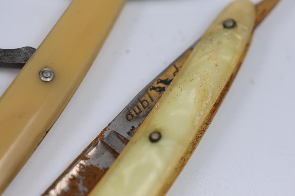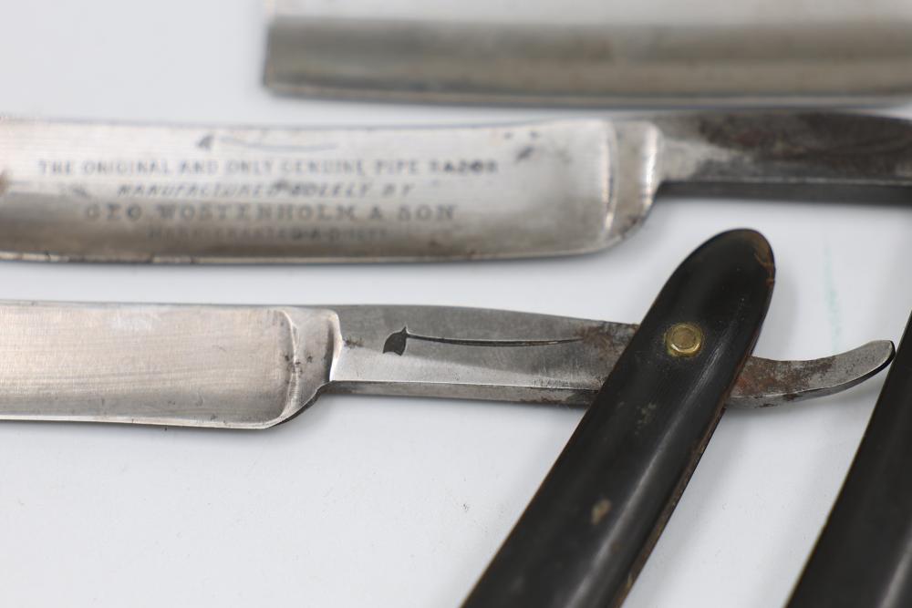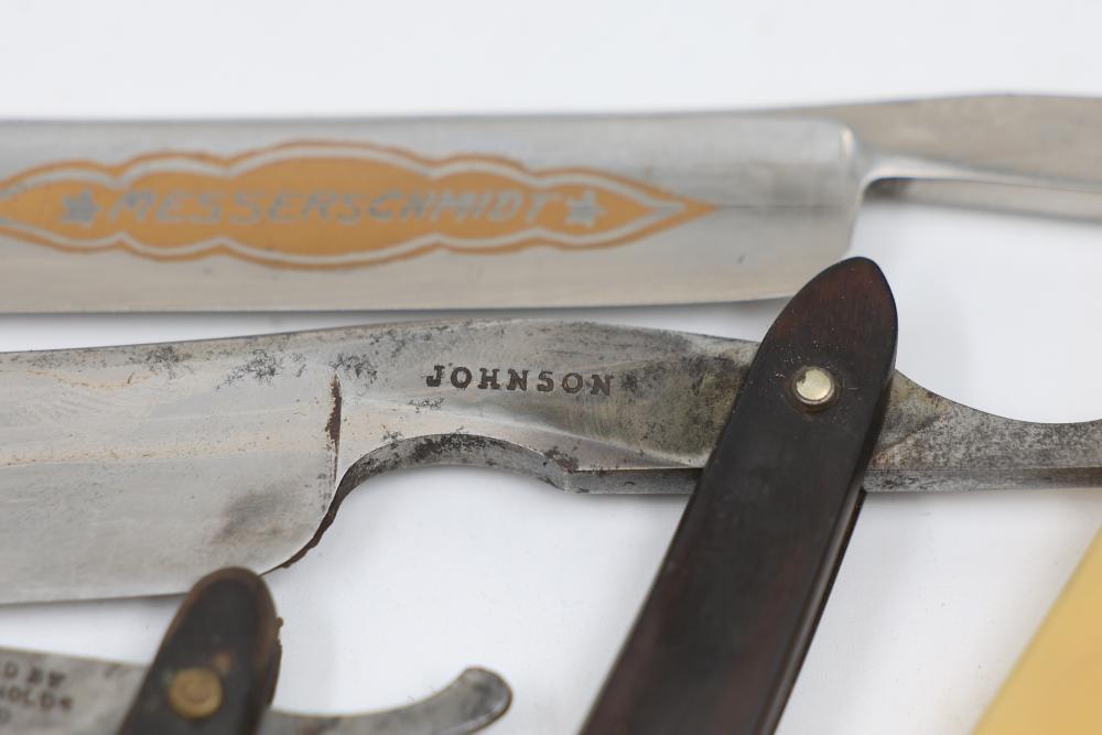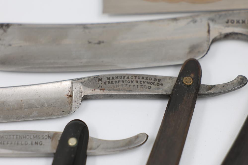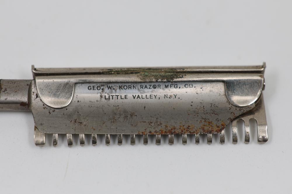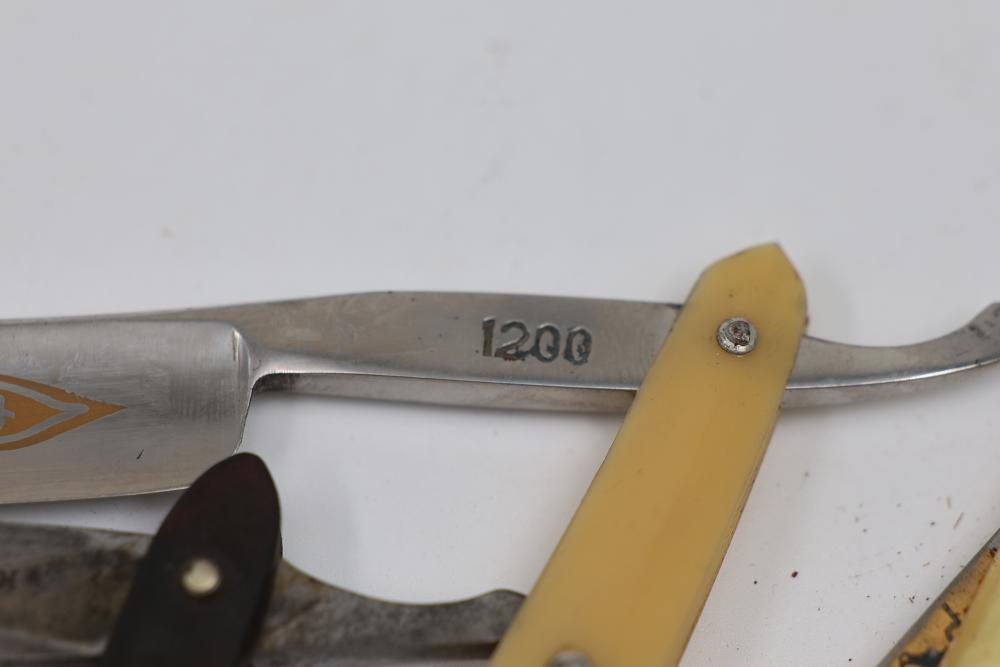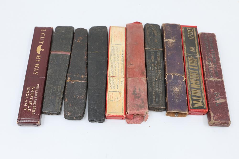 Items are from one straight razor collection & include cased matched pair of Joseph Rodgers & Sons straight razors having etched blade panels in velvet-lined Rodgers fitted case; etched motif Theodore Roosevelt & General Botha straight razor; Texas Luggage U.S. military style portable barber kit; porcelain shaving mugs with four lather brushes, collapsible compact travel shaving mirror with bowl; Warranted Razors having horn handles & notched Sheffield-style blades, etched Washington commemorative hollow blade with patriotic motif; Frederick Reynolds Sheffield straight razors; razors w/ mother of pearl scales/inlaid bar escutcheons/silver tone end caps/wedge-style blades; razors from Rogers & Sons, Wade & Butcher & Mappin's, featuring two horn scales & one celluloid with wedge style blades; razors from Clauss, J.A. Henckels, & H. Boker & Co., featuring mixed celluloid scales with hollow blades/includes multiple cases; barber accessories including razor strops/sharpening stones/boxed Schick blades; hair shapers; identification & value books & more. Items are located in Pleasant Valley, NY.